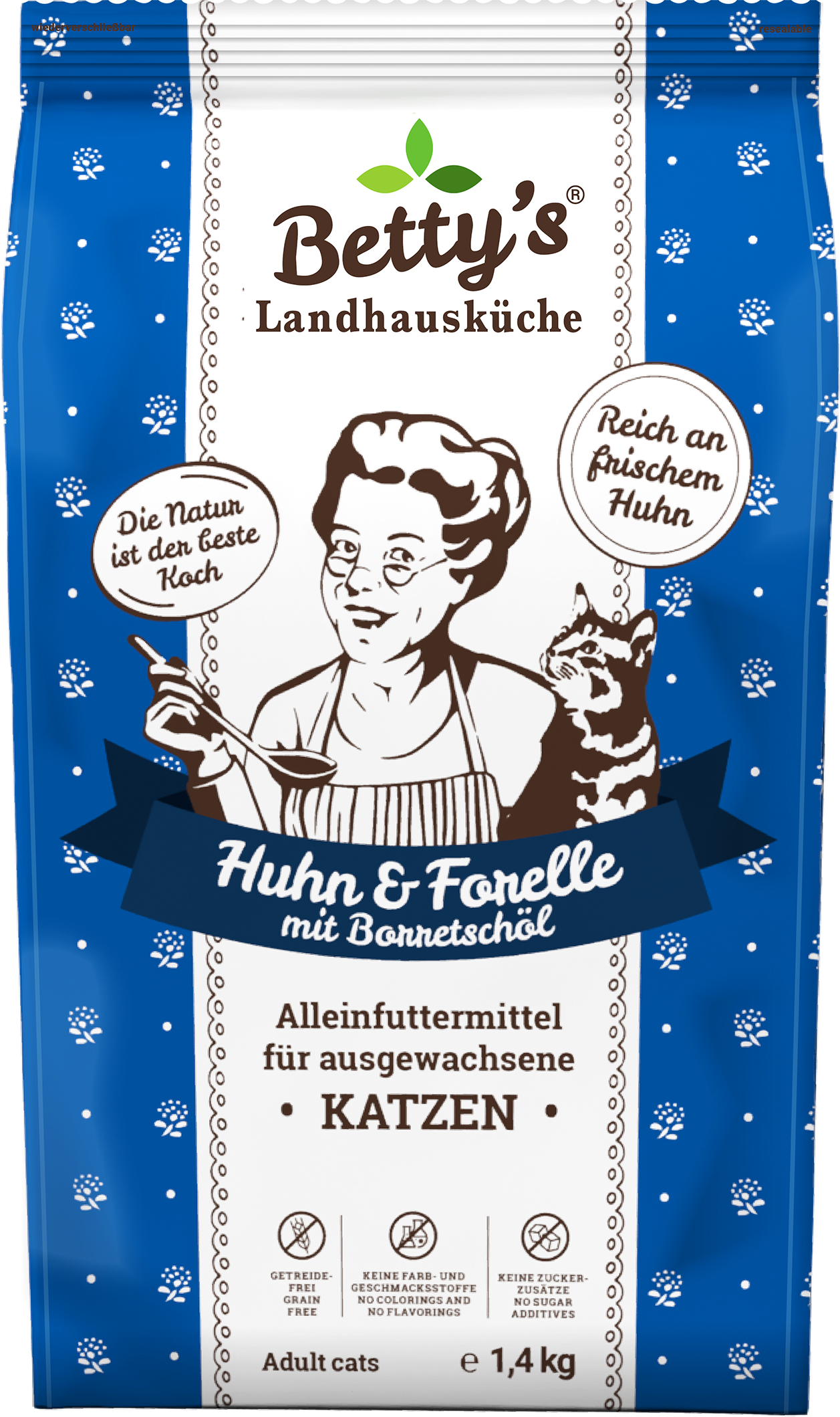 Betty's Landhausküche Felnőtt száraz macskatáp - Csirke és pisztráng, 1,40 kg