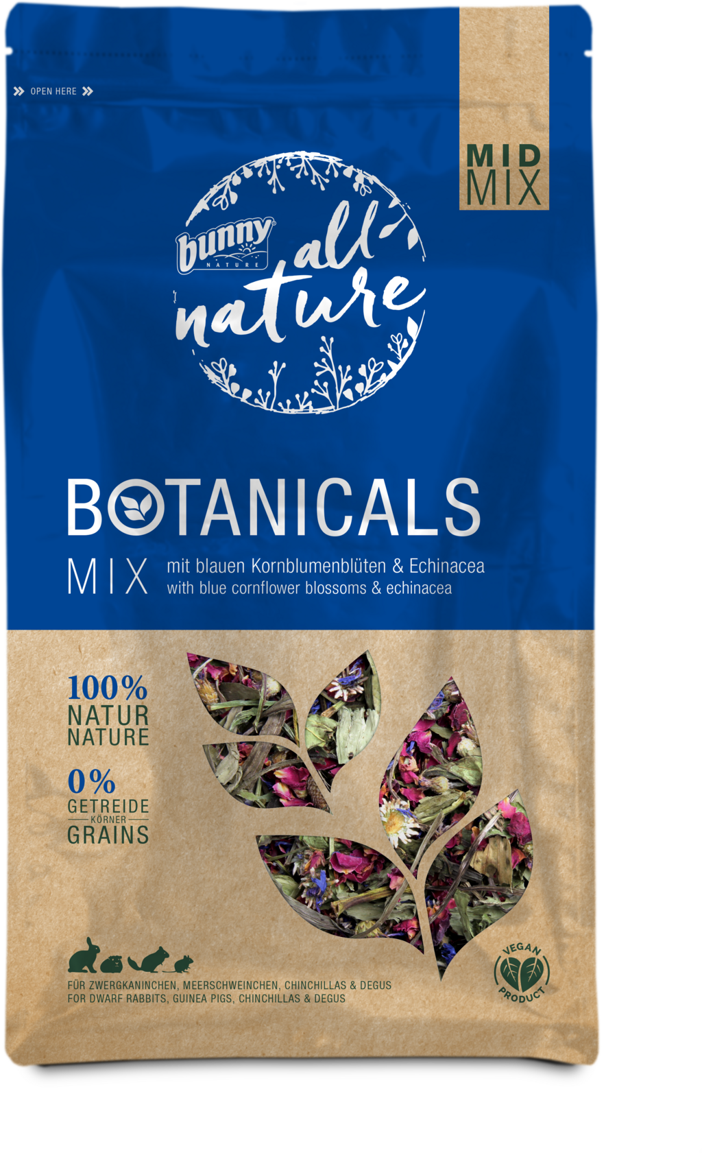 Válasszon egy bunny Botanicals MAXI MIX terméket fő összetevőként és egy bunny Botanicals MID MIX terméket, és keverje össze őket a megfelelő arányban. Adjon hozzá bunny all nature VITAMIN terméket kiegészítőként, és máris egy kiváló minőségű, teljes értékű tápot kap, amely az állatok egyéni igényeihez igazodik, teljesen mentes a pelletektől és az extrudátumoktól. Ez lehetővé teszi, hogy kiegyensúlyozott, természetes és fajnak megfelelő étrendet biztosítson állatainak.