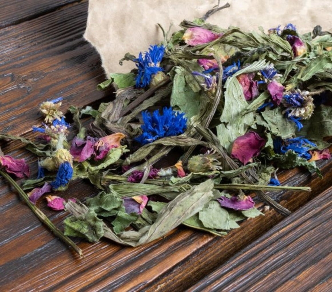 25 % kék búzavirág szirmok, 25 % echinacea, rózsaszirom, lándzsás útifű