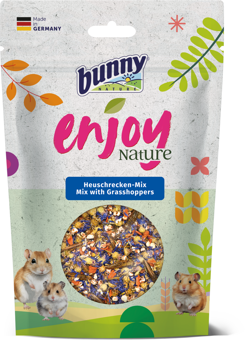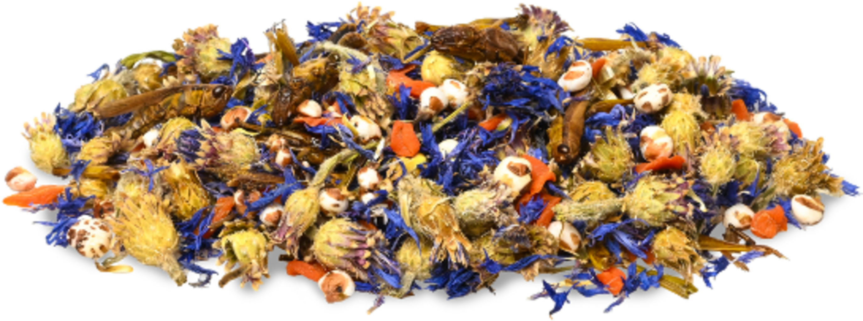 Ez a kiváló minőségű snack különösen gazdag fehérjében, és értékes kiegészítője a rágcsálók napi táplálékának. Az egyenesszárnyúak (sáskák, tücskök, szöcskék) mellett kölest és búzavirágot is tartalmaz, ízletes változatosságot víve az eleségtálba.