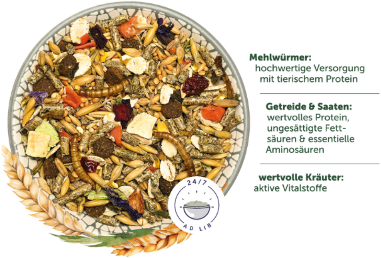 zab, árpa, pláta köles, kanárimag, borsópehely, árpapehely, tört kukorica, zabmag, búzakorpa, búza, sárgarépa, szárított baromfifehérje, napraforgódara, kukorica, ezüst köles, vörös köles, fűmag, lenmag, lucerna zöld liszt, paszternák, ásványi anyag, napraforgómag, szárított burgonya, sörtörköly, sárgarépa pép, burgonya fehérje, cékla, borsóliszt, cukorrépa rostok, inaktivált és szárított sörélesztő, gyermekláncfűfű, lucerna, cickafarkfű, szezámmag, cikória inulin, paprika, szárított tápióka, alma, 0,3 % lisztkukac, kamillavirág, csipkebogyóhéj, hidrolizált állati fehérje (hal, baromfi), szentjánoskenyér, mályvavirág, hidrolizált baromfi máj, őrölt cikóriagyökér (49 % gabonafélék, 23 % magvak, 1,5 % gyógynövények)