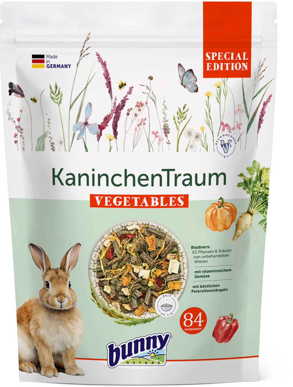 Amikor a nyuszi álmok valóra válnak... ez a finom táp biztosan a közelben lesz! 63 különböző, kezeletlen rétekről származó növénnyel és rengeteg vitamindús zöldséggel ízletes változatosságot biztosít az etetőtálban, és kiváló minőségű, fajnak megfelelő étrendet tesz lehetővé szőrös barátai számára.