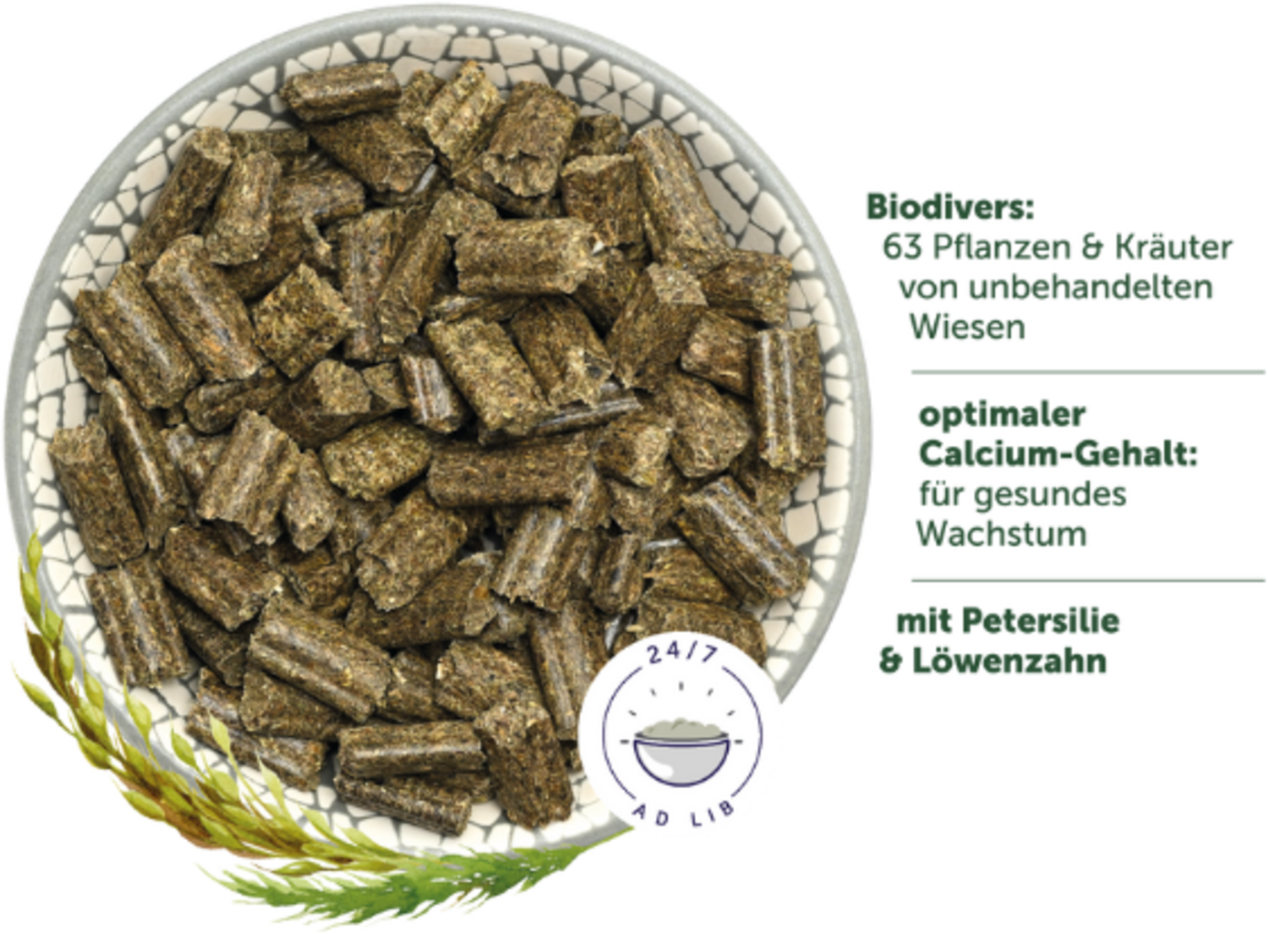 Amikor a nyuszi álmok valóra válnak... ez a finom táp biztosan a közelben lesz! 63 különböző, kezeletlen rétekről származó növénnyel és értékes inulinnal már a kezdetektől fogva ízletes változatosságot biztosít az etetőtálban, és lehetővé teszi a fiatal törpenyulaknak a kiváló minőségű, fajnak megfelelő étrendet.