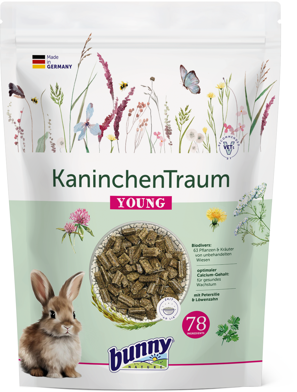 Amikor a nyuszi álmok valóra válnak... ez a finom táp biztosan a közelben lesz! 63 különböző, kezeletlen rétekről származó növénnyel és értékes inulinnal már a kezdetektől fogva ízletes változatosságot biztosít az etetőtálban, és lehetővé teszi a fiatal törpenyulaknak a kiváló minőségű, fajnak megfelelő étrendet.