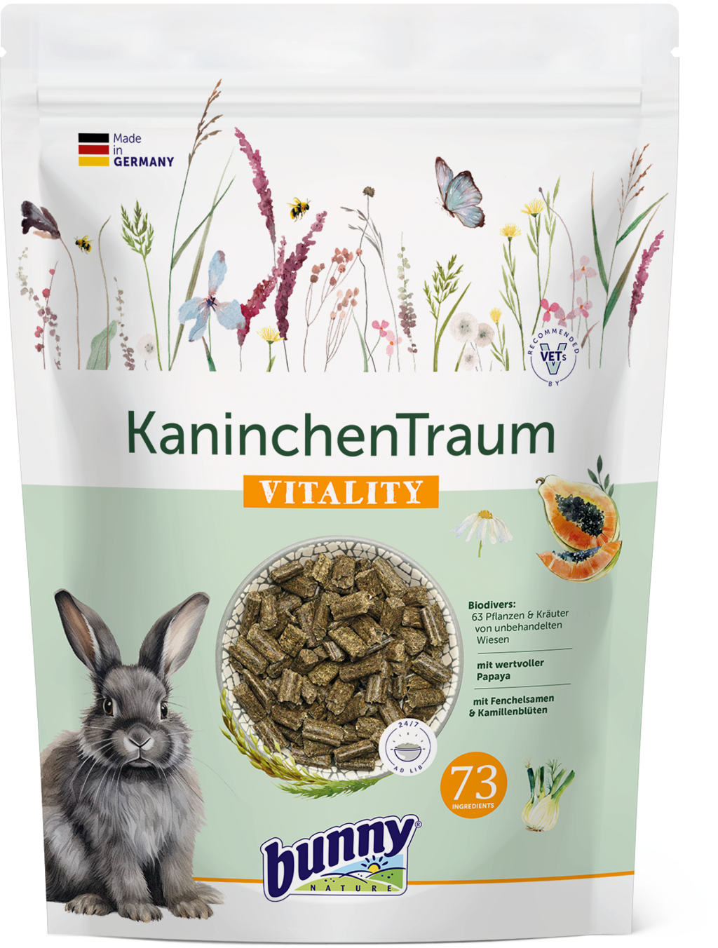 Amikor a nyuszi álmok valóra válnak... ez a finom táp biztosan a közelben lesz! 63 kezeletlen rétekről származó növény, valamint édesköménymag, kamillavirág és egzotikus papaya harmonikusan kiegyensúlyozott keverékével ízletes változatosságot biztosít az etetőtálban, és kiváló minőségű, fajnak megfelelő étrendet tesz lehetővé szőrös barátai számára.