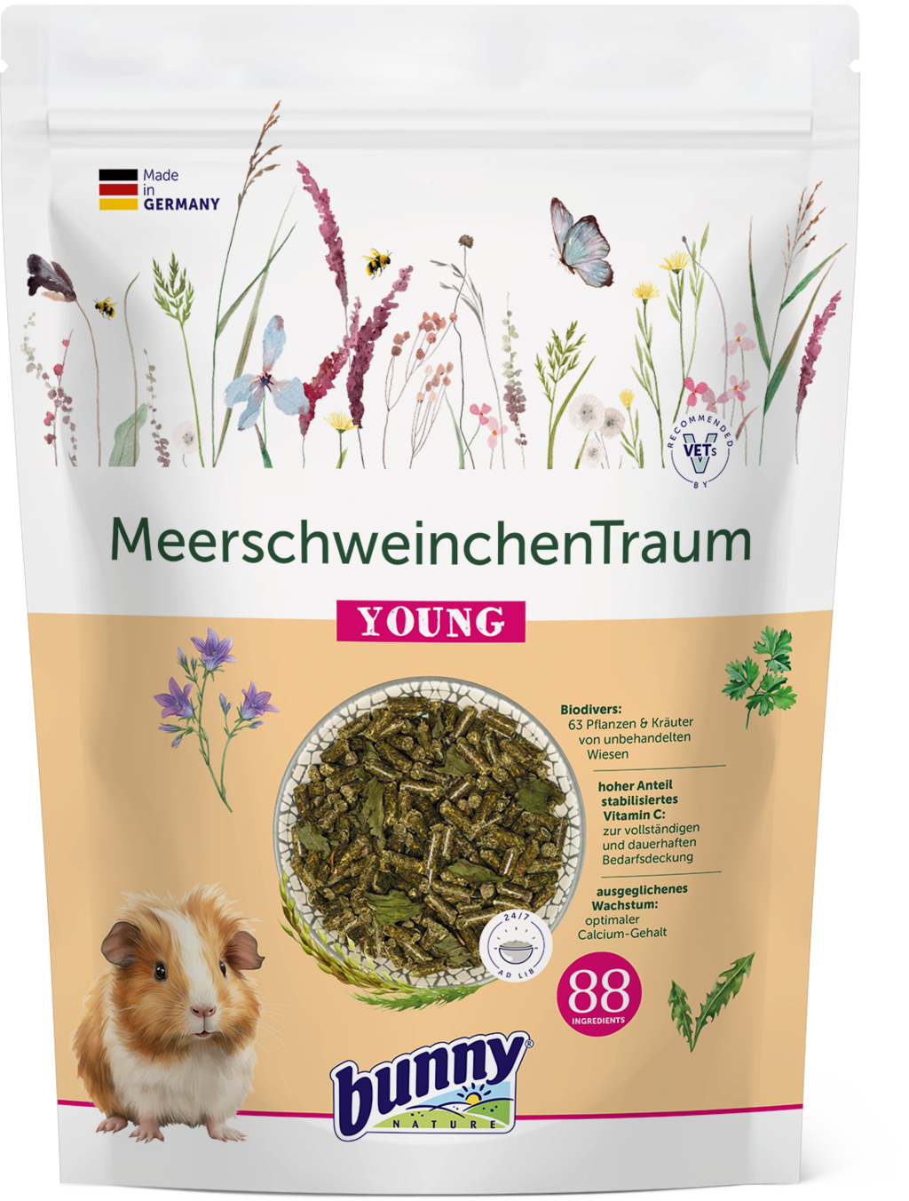 Amikor a tengerimalacok álmai valóra válnak... ez a finom eledel biztosan a közelben lesz! 63 különböző, kezeletlen rétekről származó növénnyel, stabilizált C-vitaminnal és olyan összetevőkkel, mint a quinoa, amaránt, arónia bogyók és maca, már a kezdetektől ízletes változatosságot biztosít az etetőtálban, és garantálja a fiatal tengerimalacok számára a kiváló minőségű, fajnak megfelelő étrendet.