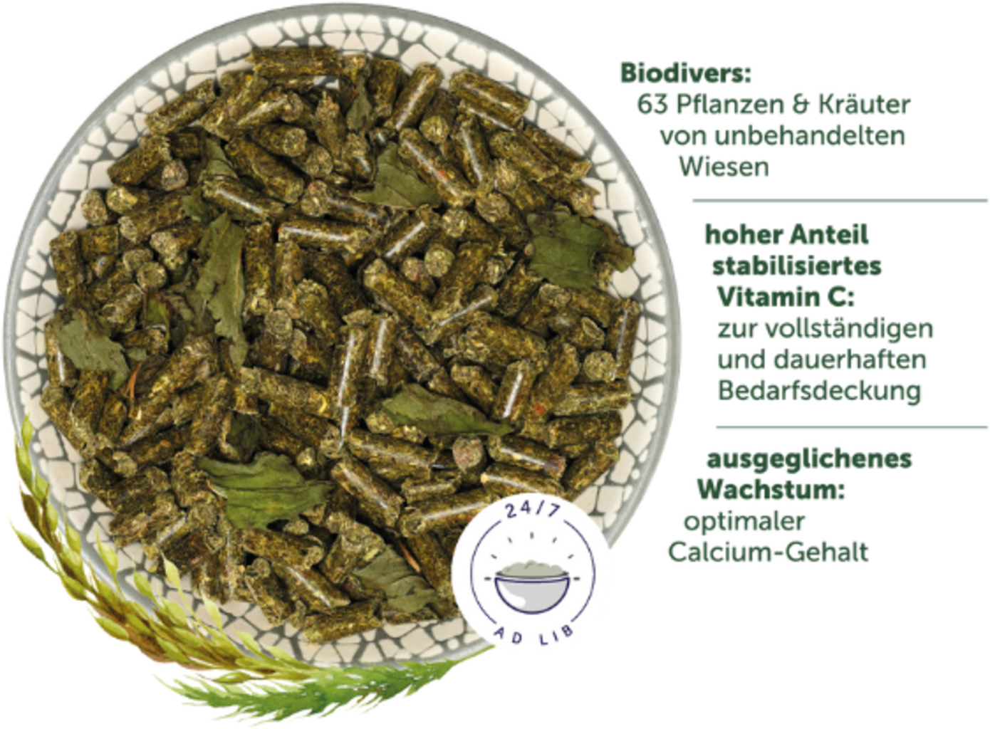 állandó gyepből származó növényi anyag (timothy fű, réti csenkesz, vörös csenkesz, réti ecsetpázsit, réti perje, csomós ebír, erdei turbolya, szúrós gyermekláncfű, réti lednek, közönséges cickafark, palástfű, borjúpázsit, mezei lóhere, lándzsás útifű, mezei zsálya, közepes rezgőfű, álló tarack, terebélyes harangvirág, fűszerkömény, réti imola, közönséges madárhúr, mezei bogáncs, puharozsnok, közönséges gyermekláncfű, gyepes sédbúza, valódi mézfű, mezei gyűszűvirág, erdei szamóca, szöszös bükköny, ösztörűs veronika, réti zörgőfű, valódi madársóska, bolyhos réti zab, közönséges szarvaskerep, mezei zsurló, fehér galaj, fehér gólyaorr, réti margitvirág, mezei sóvirág, réti kakukkszegfű, közönséges vérfű, mezei veronika, franciaperje, réti perje, réti útifű, orvosi vérfű, fekete bükköny, mezei nefelejcs, bibircses kőtörőfű, hasznos földitömjén, kúszó pimpó, valódi kankalin, kónya habszegfű, kis vérfű, mezei csillagmoha, réti bakszakáll, nagy csalán, kakukk veronika, vöröshere, gyepűbükköny, közönséges ínfű, köszvényfű, kamilla), zabkorpa, napraforgódara, sárgarépa pép, teljes növény kukorica, lendara, repcedara, sörtörköly, sárgarépa, lignocellulóz, lenmag, csicsóka levél, inaktivált és szárított sörélesztő, paprika, borsmentalevél, cikória inulin, quinoa mag, amaránt, arónia törköly, kalcium-karbonát, petrezselyemlevél, dikálcium-foszfát, kamillavirág, cickafarkfű, pitypang levél, macagyökér
