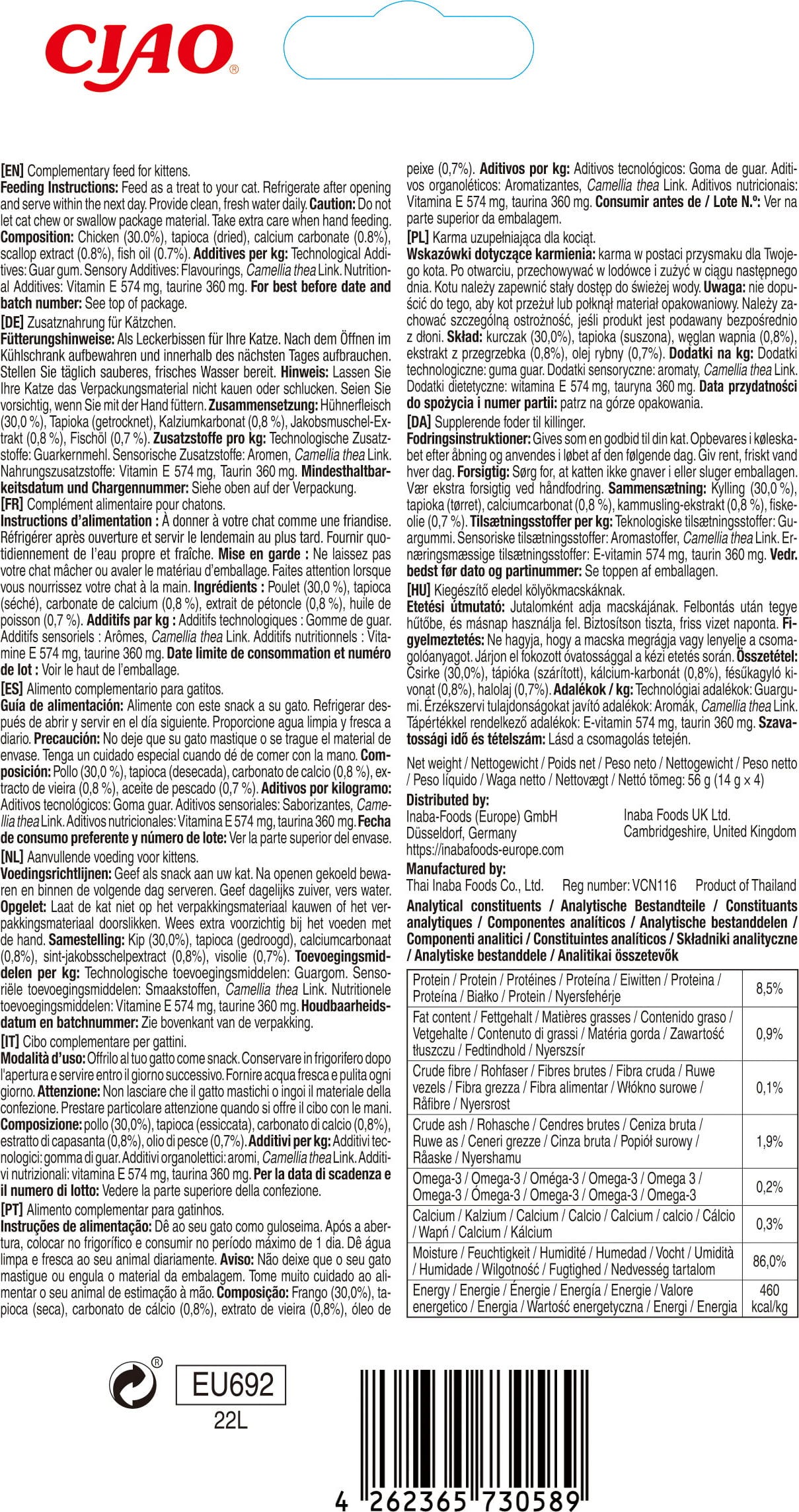 30 % csirkehús, szárított tápióka, 0,8 % kalcium-karbonát, 0,8 % fésűkagyló kivonat, 0,7 % halolaj