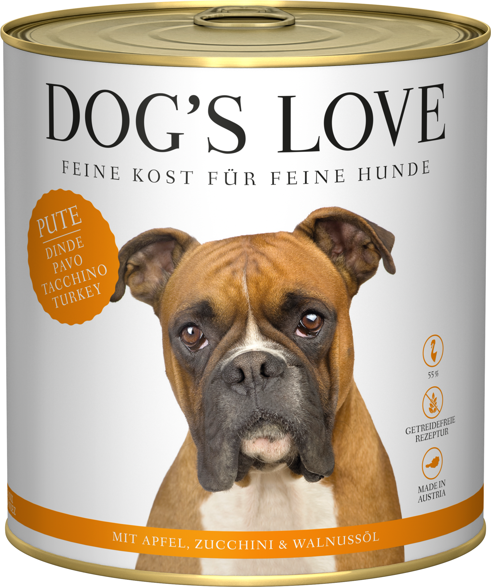 55 % pulyka (30 % pulykahús, 17 % pulykaszív, 8 % pulykamáj), 15 % cukkini, 12 % sárgarépa, 10 % alma, burgonyakeményítő, ásványi anyag, 9 % dióolaj, tojáshéjpor, tengeri alga por, szilícium-dioxid, pitypang levél, csalánlevél, körömvirág, vízitorma