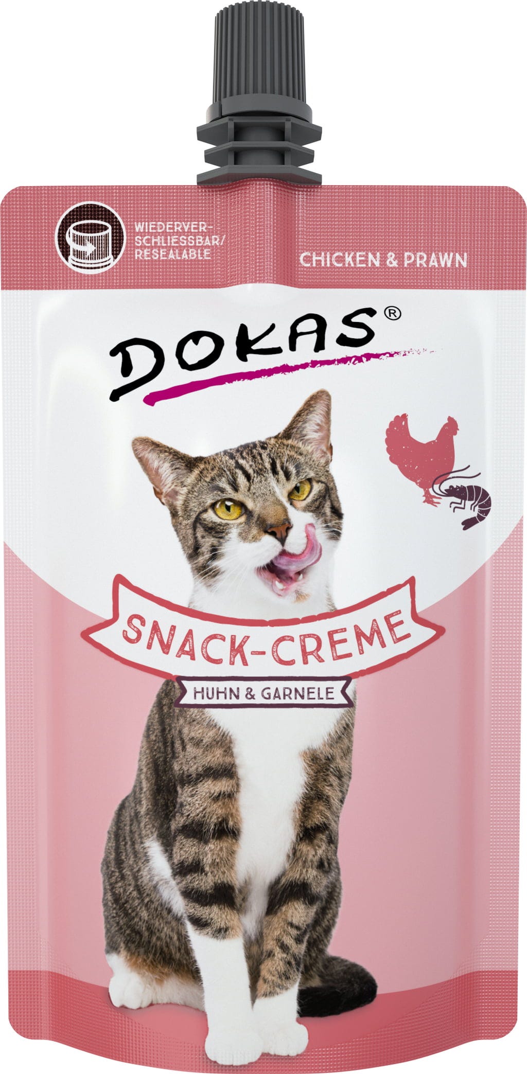 A Dokas snack-krém finom ízével különösen népszerű a macskák körében. Használja a krémet a száraztáp feltétjeként vagy ízletes jutalomként két étkezés között. A praktikus zárnak köszönhetően a snack-krémet a következő etetésig egyszerűen tárolhatja.