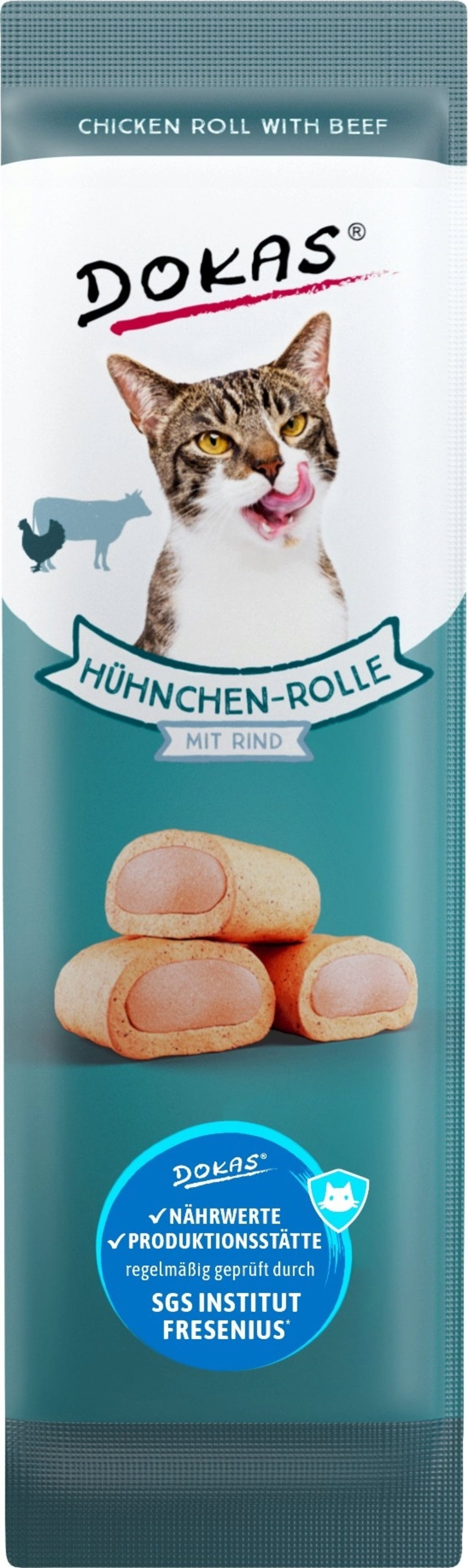 A Dokas csirkeroládja izgalmas állagával nyűgözi le a házi kedvenceket. A zsenge csirkehúsból készült külső réteg alatt lágy belső rejtőzik, amely egészen különleges ízélményt nyújt. Ez a fenséges kombináció garantáltan dorombolásra készteti macskáját.