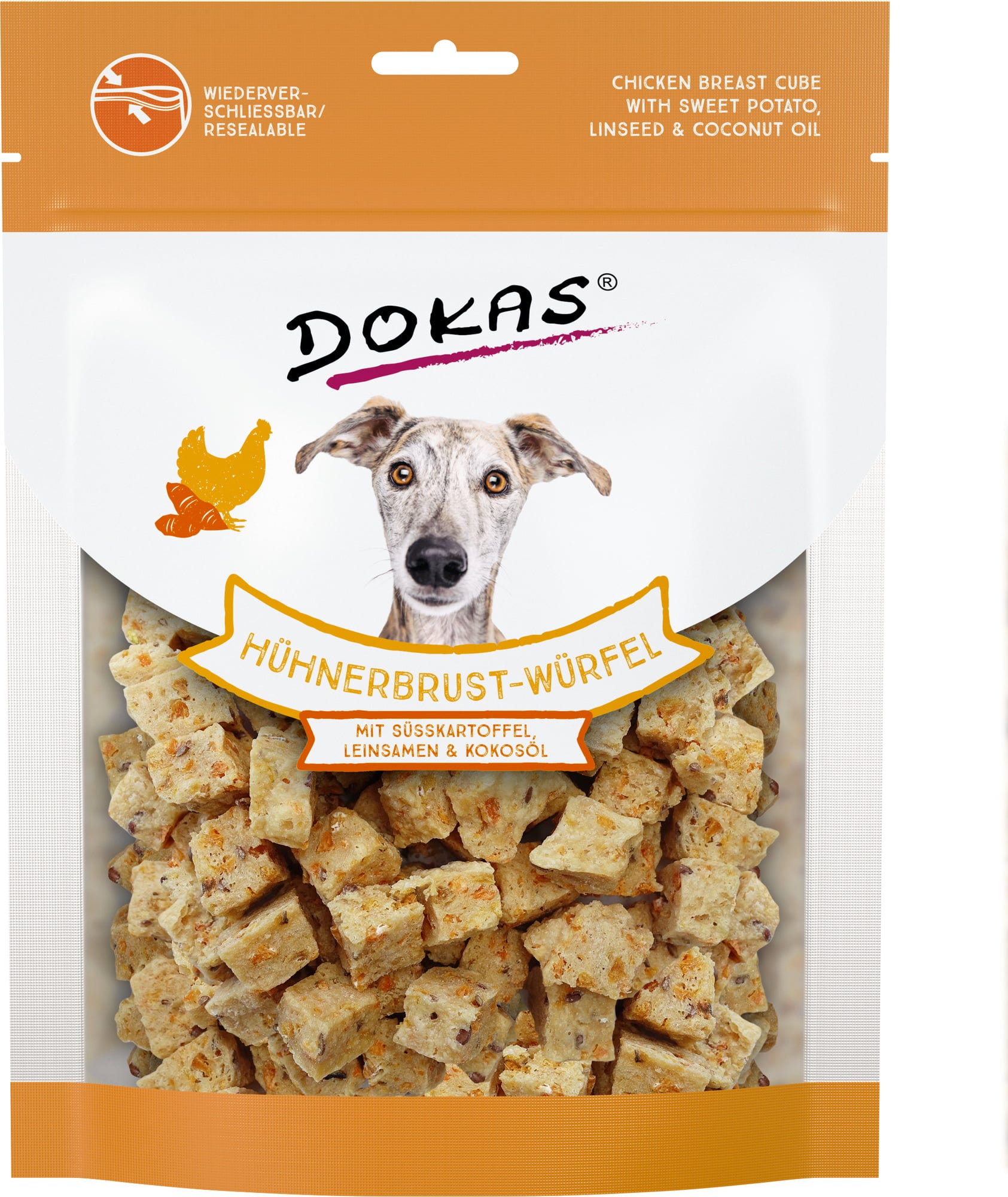 A Dokas csirkemell kockák édesburgonyával, lenmaggal és kókuszolajjal egy különlegesen ropogós snack. Különlegessége: a fagyasztva szárításos eljárás 100%-ban megőrzi az ízeket és a benne lévő tápanyagokat.