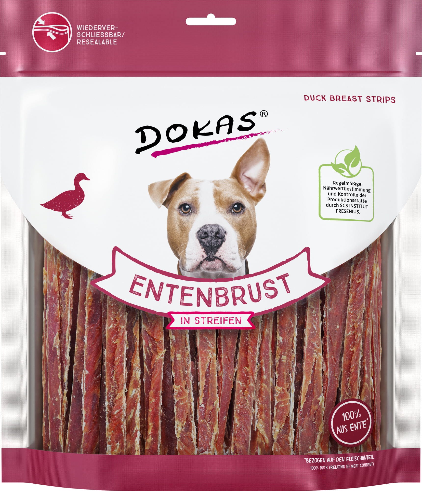 A Dokas finom húscsíkjai kíméletesen, levegőn szárítottak és különösen zsírszegények. 100% kiváló minőségű kacsahúsból* készülnek, és nagyszerű snackként szolgálnak két étkezés között. Különleges élvezet, amely garantáltan hálás kutyatekinteteket eredményez.