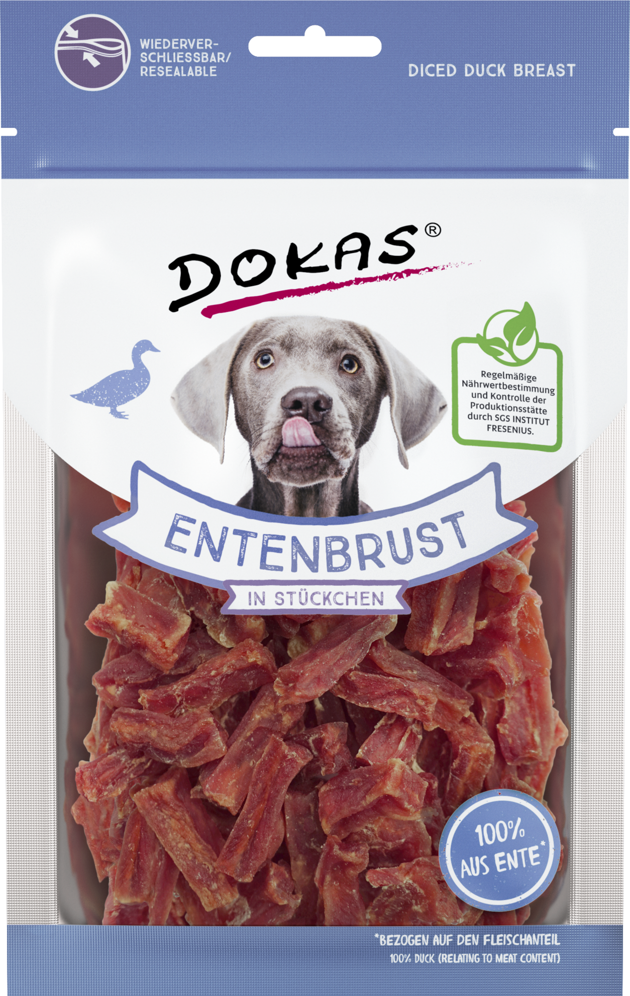 A Dokas kacsamell falatkák 100% kacsamellfiléből* készülnek, és különösen zsírszegény élvezetet nyújtanak. Az apró falatkák ideális motivációt jelentenek a tréning során, és útközben is mindig jó választásnak bizonyulnak.