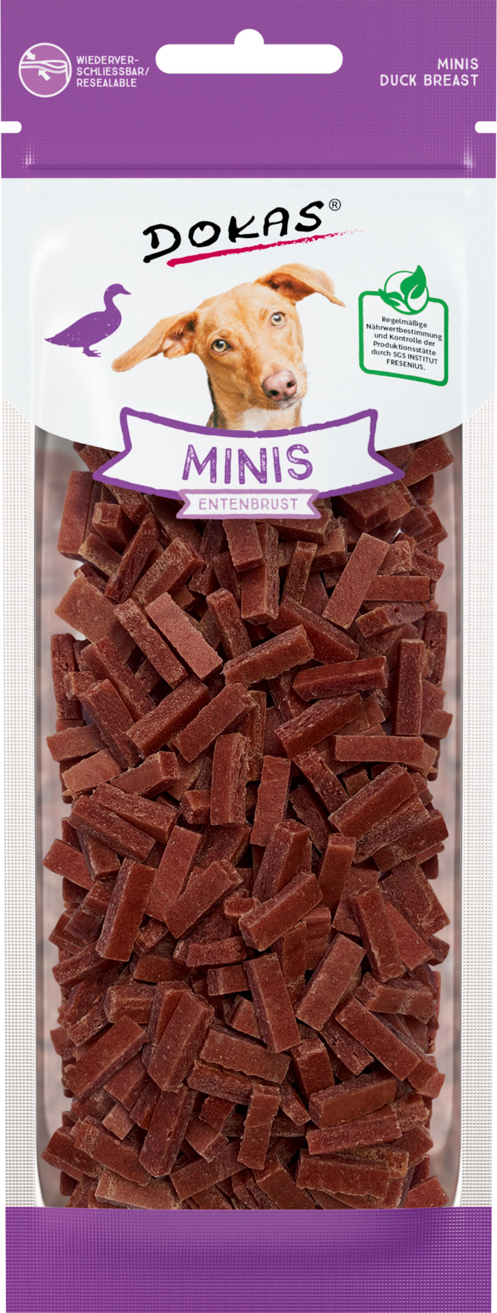 A Dokas 100% kacsamellhúsból* és értékes L-karnitinnel készült Minis snackje kompakt méretének köszönhetően ideális motivációt jelent a kedvencével végzett edzések során. A praktikus csomagolásnak köszönhetően a Minis útközben is adható a háziállatoknak.