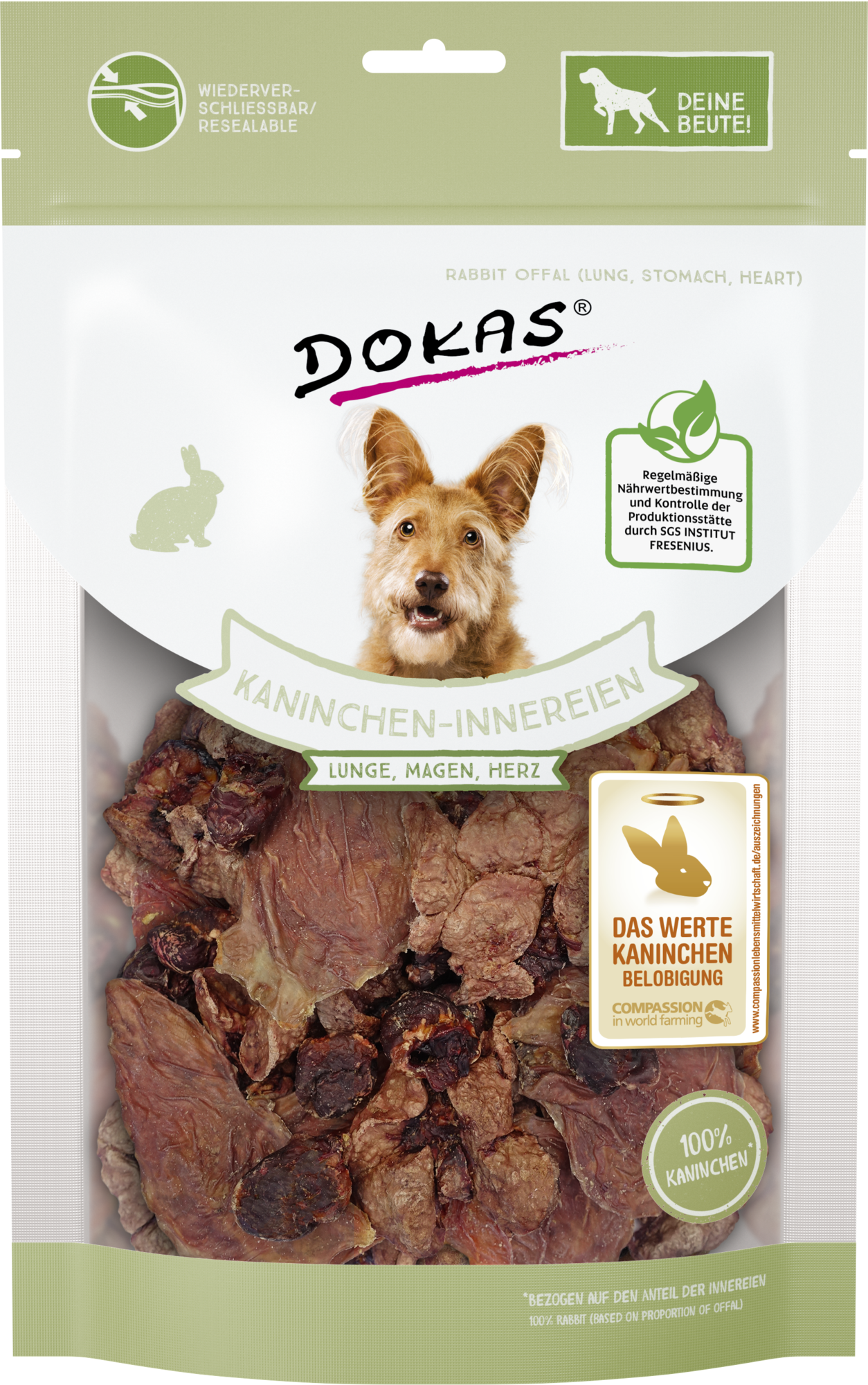 A Dokas nyúlbelsőségek nyúltüdőt, -gyomrot, -májat és -szívet tartalmaznak. Autentikus táplálkozási élményt nyújtanak kutyájának, és a BARF-módszerhez is kiválóan alkalmasak.