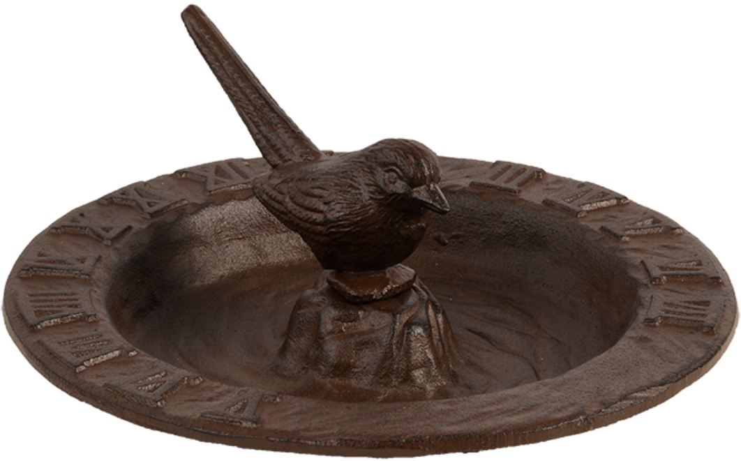 A kézzel készült, öntöttvas madárfürdővel ellátott dekoratív napóra többféleképpen használható: madárfürdőként, etetőtálként és napóraként. Napóraként való használathoz a madár farkának észak felé kell néznie. Akár a teraszon, akár a kertben, a környék madarai le fogják nyűgözni!