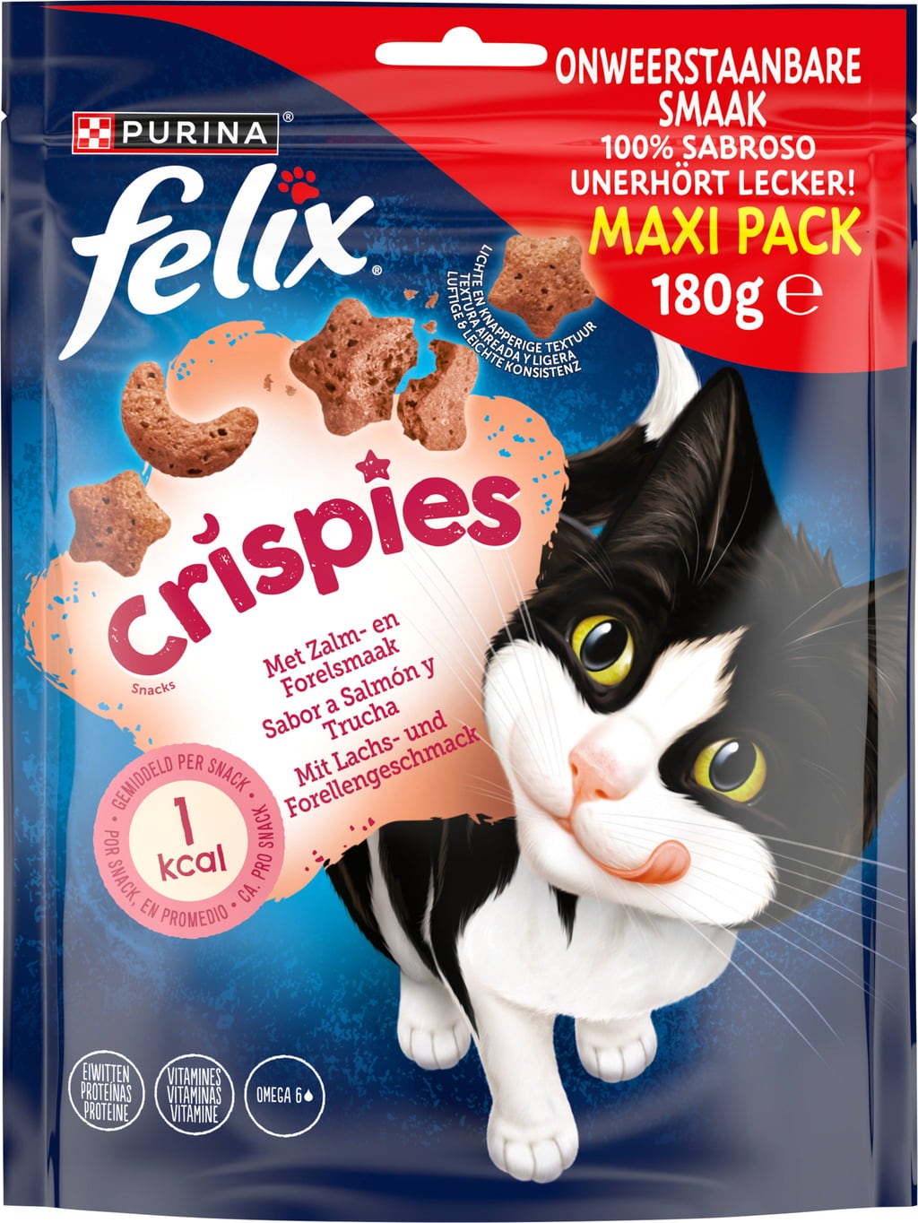 A Felix Crispies különleges ízélményt biztosít, és felébreszti az oroszlánt kedvencében! A ropogós párnák légies állagúak. A lazac és a pisztráng ízével kényezteti cicáját és nem tartalmaz mesterséges színezékeket.