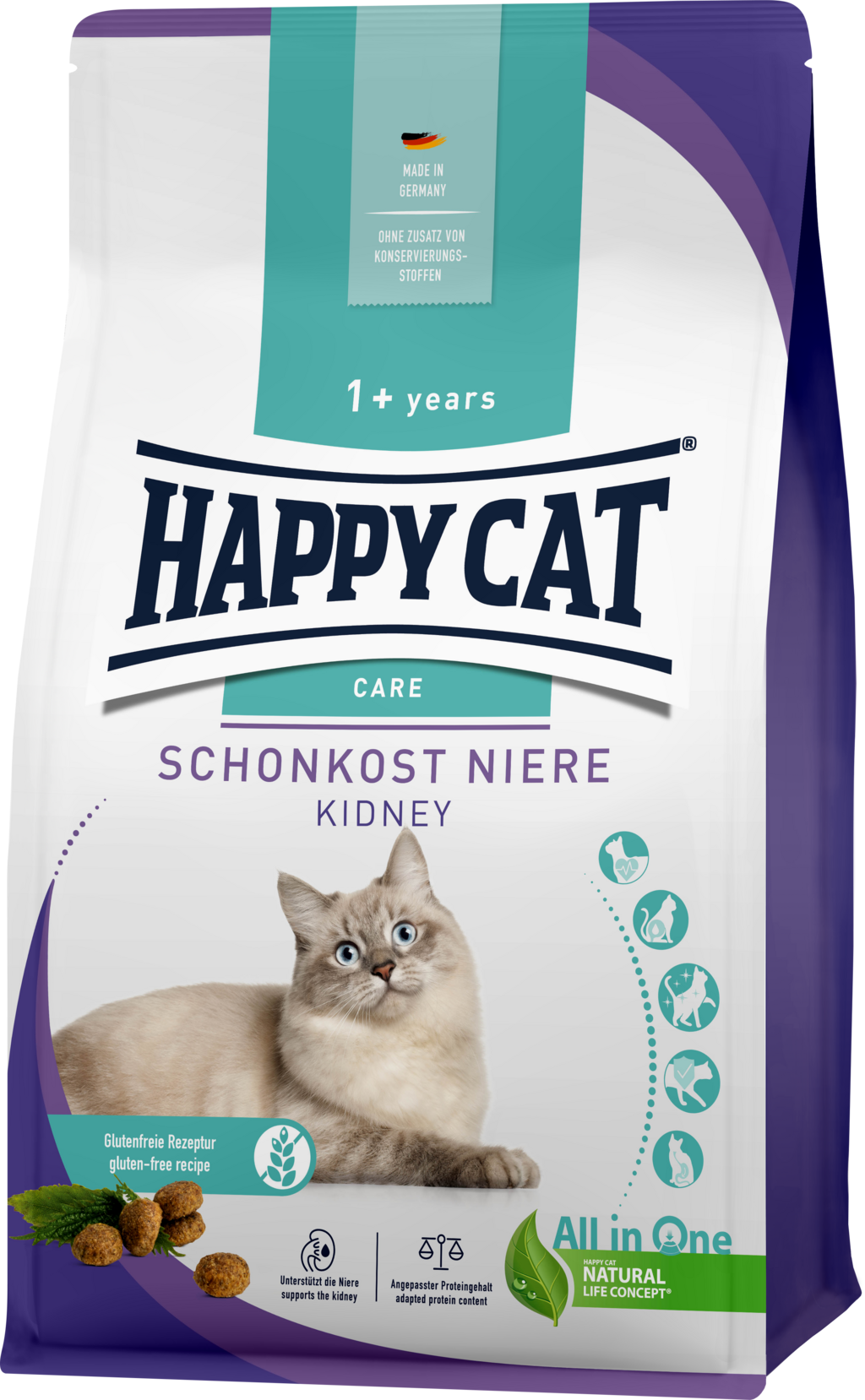 ►Megjegyzés: A száraztáp ideális a veseelégtelenség korai szakaszában lévő macskák etetésére. A diagnózist és ezt követően a Happy Cat Care Vesekímélő száraztáp etetését is állatorvossal kell tisztázni!