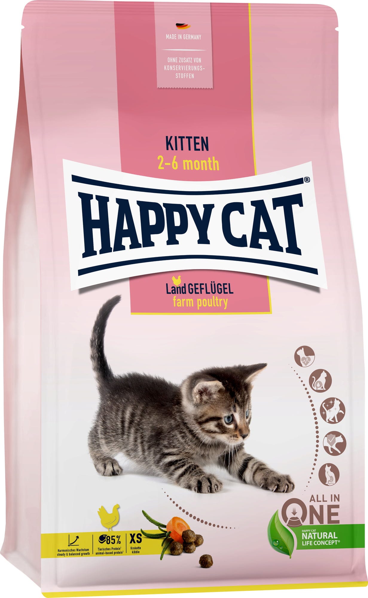A növekedés nem könnyű folyamat! Hogy a lehető legjobban támogassa a fiatal kiscicákat, a Kitten vidéki baromfi száraztáp a lehető legjobb táplálékot biztosítja számukra. Az ízletes szárazeledel extra kicsi krokettekkel (5 mm), jól emészthető vidéki baromfival, ízletes sárgarépával és fűszeres rozmaringgal készült. A fenséges receptúra így maximálisan támogatja a fiatal kiscicák harmonikus növekedését!