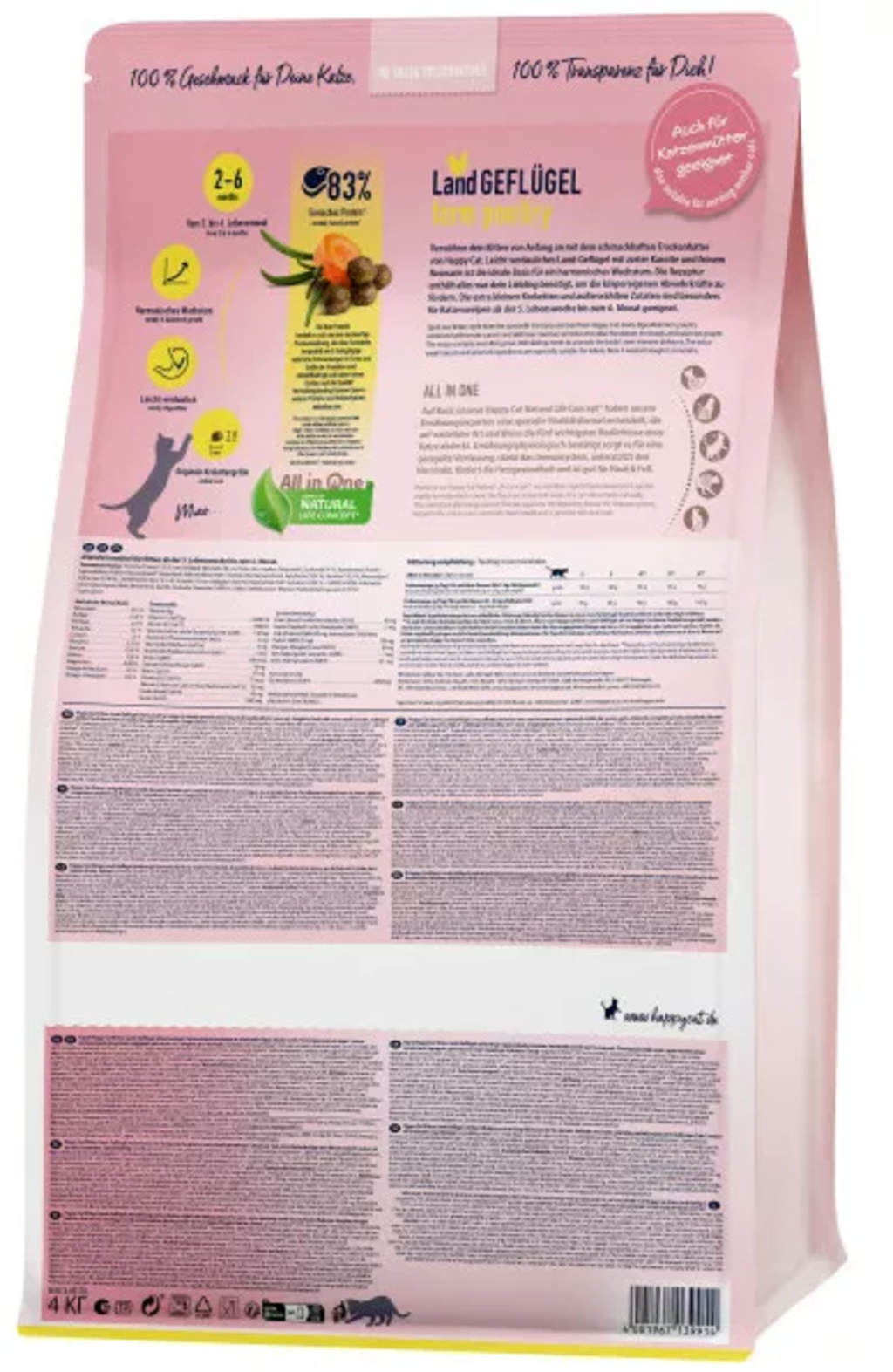 állati fehérje (33 % szárnyas)[1], kukoricaliszt, olajok és zsírok, rizs, tepertő, rizsfehérje[1], 4 % lazacliszt, hidrolizált fehérje[1], lignocellulóz, répamelasz szelet (cukormentesített)[1], kálium-klorid, élesztő[1], szárított egész tojás, nátrium-klorid, 0,4 % almatörköly[1], 0,2 % szárított sárgarépa[1], tengeri alga[1], 0,16 % lenmag, cikóriapor (0,15% = 0,1% inulin), 0,04 % Yucca schidigera[1], máriatövis, élesztő (kivont, 0,02% = 0,0032% MOS)[1], articsóka, gyermekláncfű, gyömbér, nyírfa, csalán, kamilla, koriander, 8 % rozmaring, zsálya, édesgyökér, Thymian (szárított fűszernövény összesen: 0,16%)
