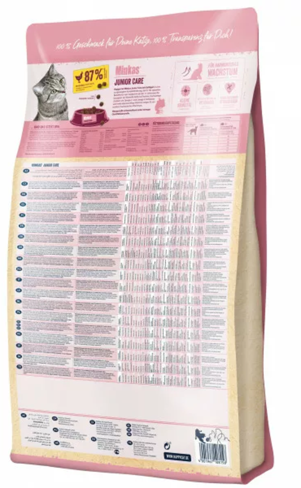 A Minkas Junior Care száraztáp 87%-os baromfiarányával kifejezetten a fiatal kiscicák táplálkozási igényeinek kielégítésére lett kifejlesztve 13 hetes kortól. Az értékes vitaminok és ásványi anyagok, valamint az állati eredetű fehérjék magas aránya fedezi az aktív cicák energiaszükségletét.