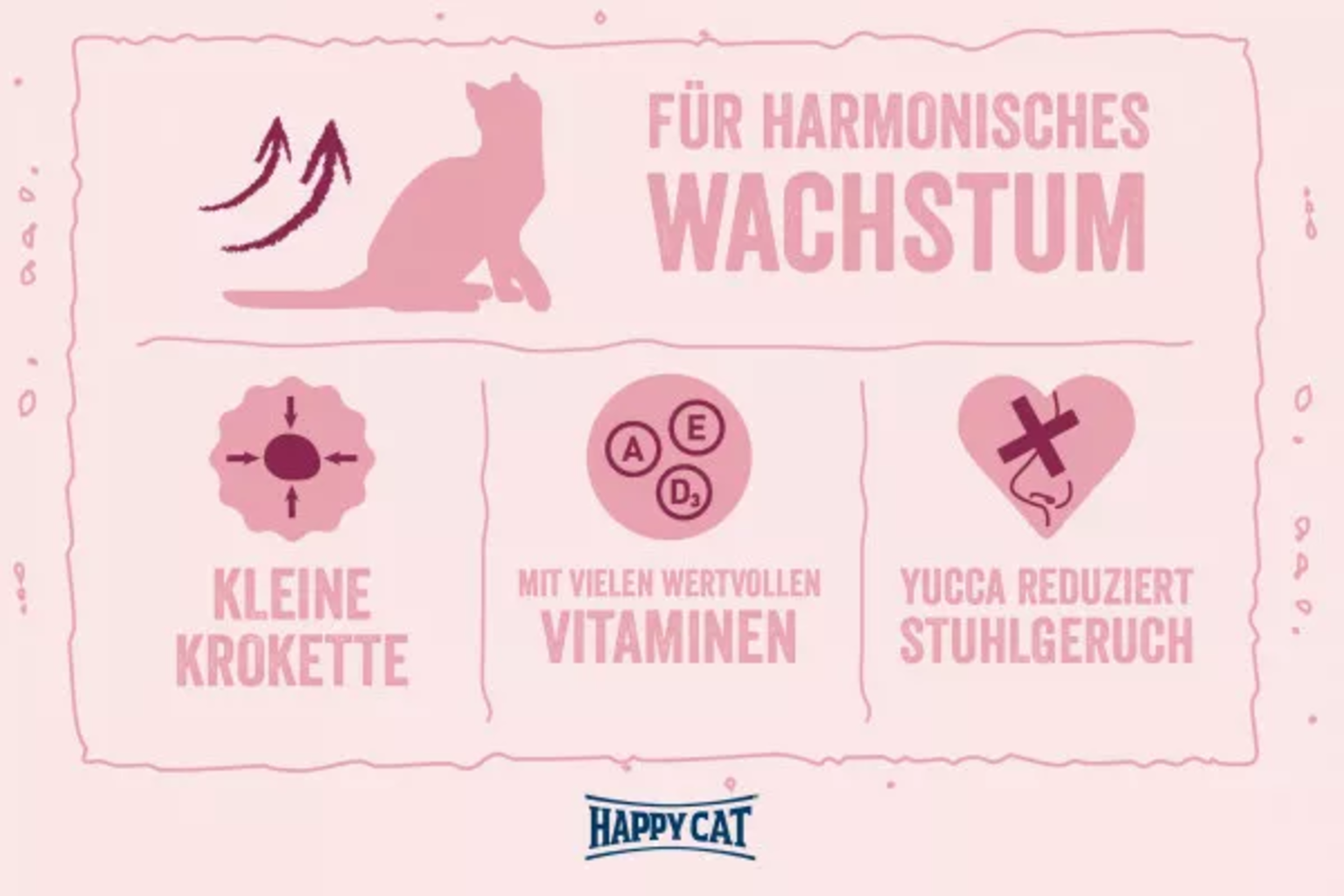 Az ízletes, kisméretű (7 mm) kroketteket a fiatal cicák nagyon könnyen el tudják fogyasztani. A Yucca schidigera emellett csökkentheti a székletszagot.