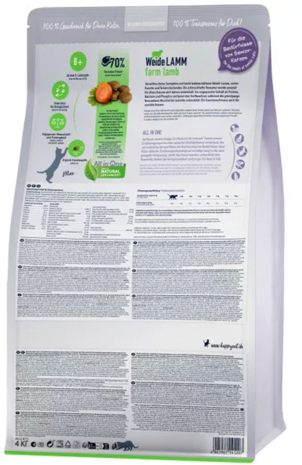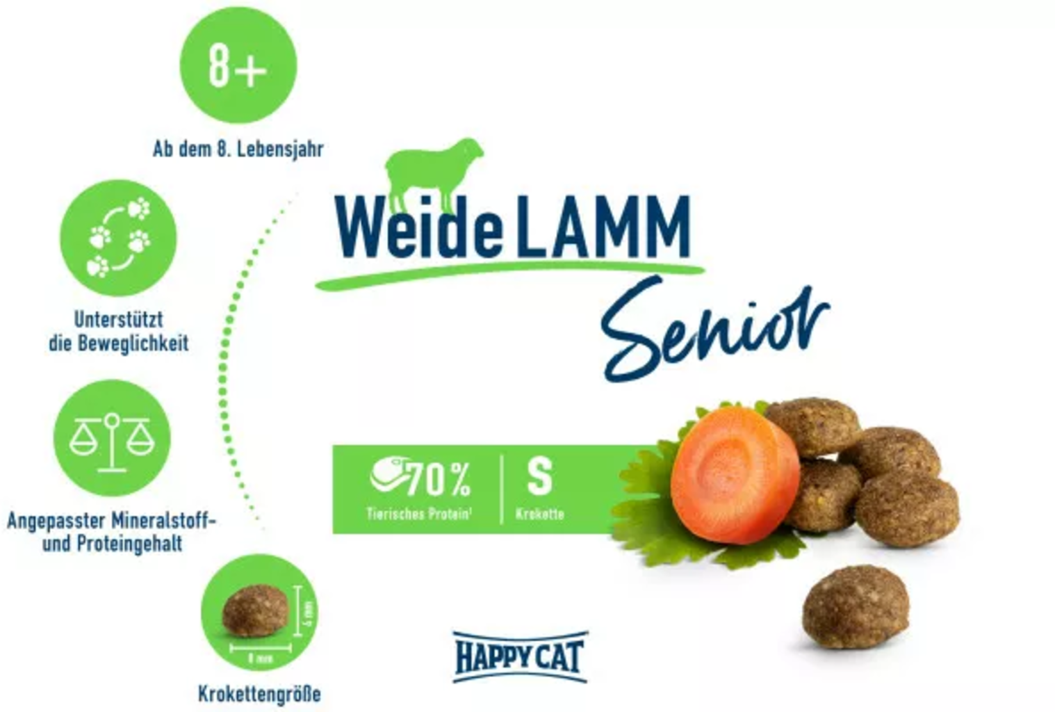 Az idősebb macskáknak speciális eledelre van szükségük a változó igényeiknek megfelelően. A Happy Cat ízletes Senior száraztápja jól emészthető bárányhússal, fűszeres korianderrel és ropogós sárgarépával kényezteti idős kedvencét. A finom krokettek adaptált fehérje-, nátrium- és foszfortartalommal rendelkeznek, hogy optimálisan támogassák idős háziállata anyagcseréjét. Új-zélandi zöldkagylóval.
