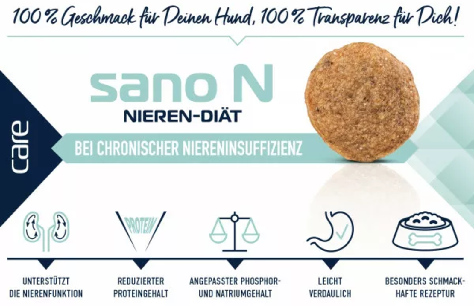 A Happy Dog Sano N száraztápja kifejezetten ideális a krónikus veseelégtelenségben szenvedő kutyák számára. A vesekímélő receptúra optimálisan adaptált fehérje-, foszfor- és nátriumtartalommal rendelkezik, ami hozzájárulhat a legyengült vesék tehermentesítéséhez. Az antioxidánsként jelen lévő E-vitamin megköti a szabad gyököket, és aktívan védheti a sejteket.