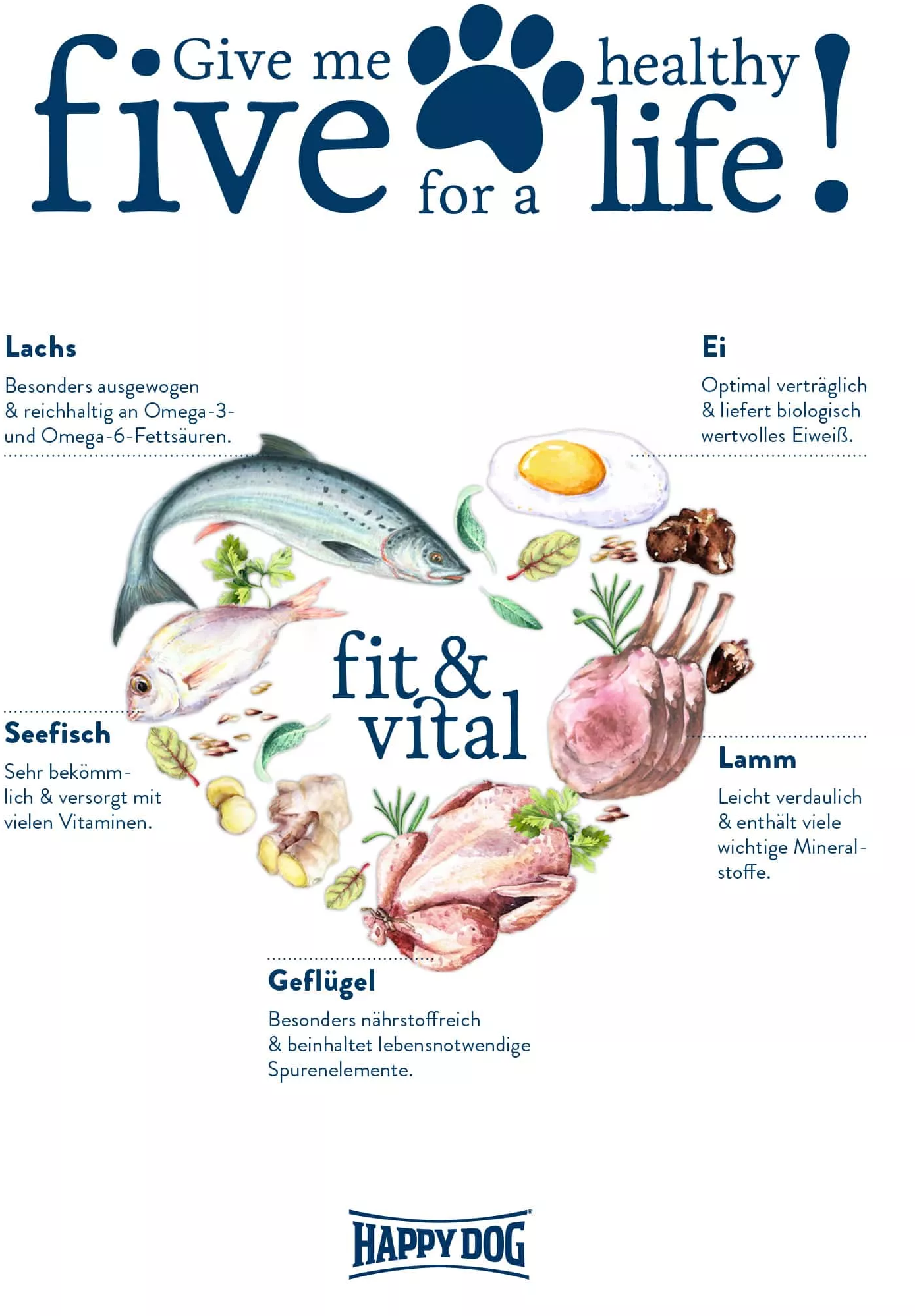 állati fehérje (baromfi 16%, bárány 4%)[1], kukoricaliszt, kukorica, rizs, árpa, 5,8 % lignocellulóz, halliszt (5%, ebből 50% lazacliszt), tepertő, hidrolizált fehérje, répamelasz szelet (cukortalanított)[1], olajok és zsírok, almatörköly[1], kálium-klorid, élesztő[1], nátrium-klorid, tengeri alga[1], 0,16 % lenmag, 0,1 % szárított egész tojás, máriatövis, 0,02 % kagylóhús[1], Yucca schidigera[1], élesztő (kivont)[1], articsóka, gyermekláncfű, 15 % gyömbér, nyírfalevél, csalán, kamilla, koriander, rozmaring, zsálya, édesgyökér, Thymian