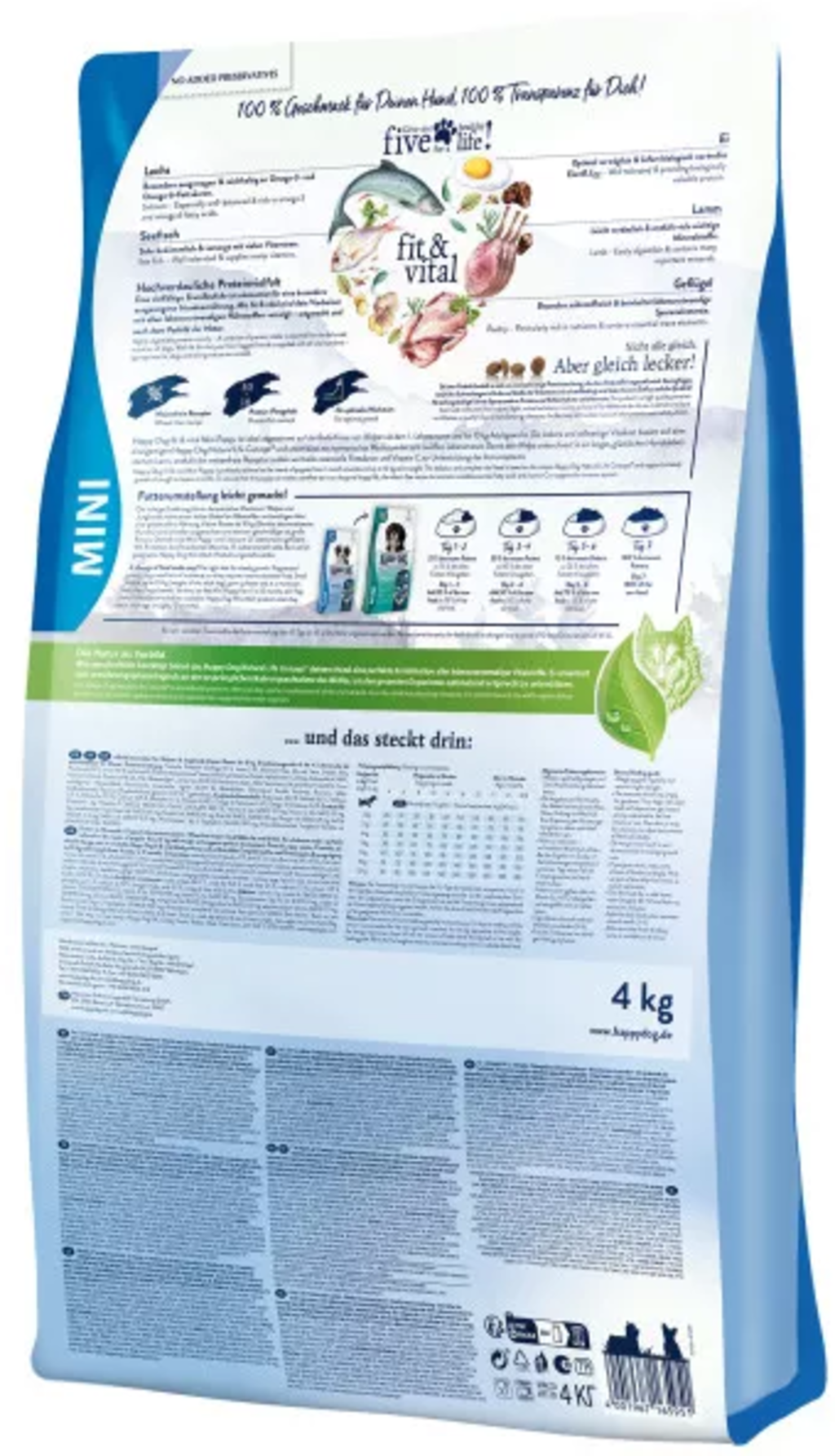 A Fit&Vital Mini Puppy egy kiegyensúlyozott száraz eledel kistestű fajtájú kölyök- és fiatal kutyák számára az 1. élethónaptól. A gluténmentes eledel ízletes receptúrája öt gondosan válogatott állati fehérjét tartalmaz bárányból, marhából, szárnyasból, halból és tojásból. Összehangolt kombinációban ezek a kiváló minőségű összetevők támogathatják kis kedvence harmonikus növekedését.
