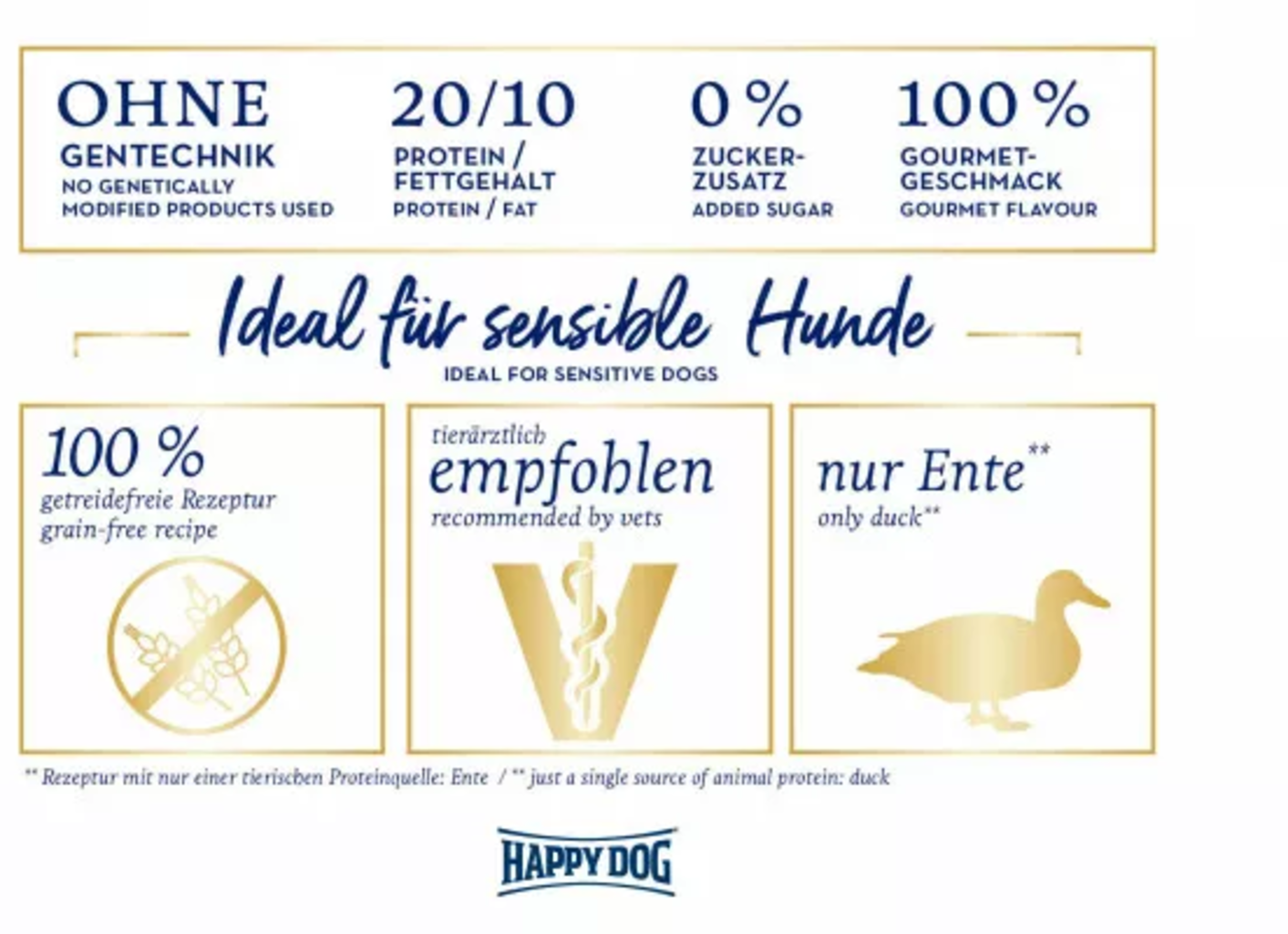 A Happy Dog márka Supreme France száraztápja ideális választás emésztési problémákkal küzdő kutyák számára. Ez a könnyen emészthető eledel kizárólagos állati fehérjeforrásként prémium kacsát tartalmaz. Gluténmentes burgonyával finomítva, ez a finom csemege még az igényes ínyenceknek is ízleni fog!