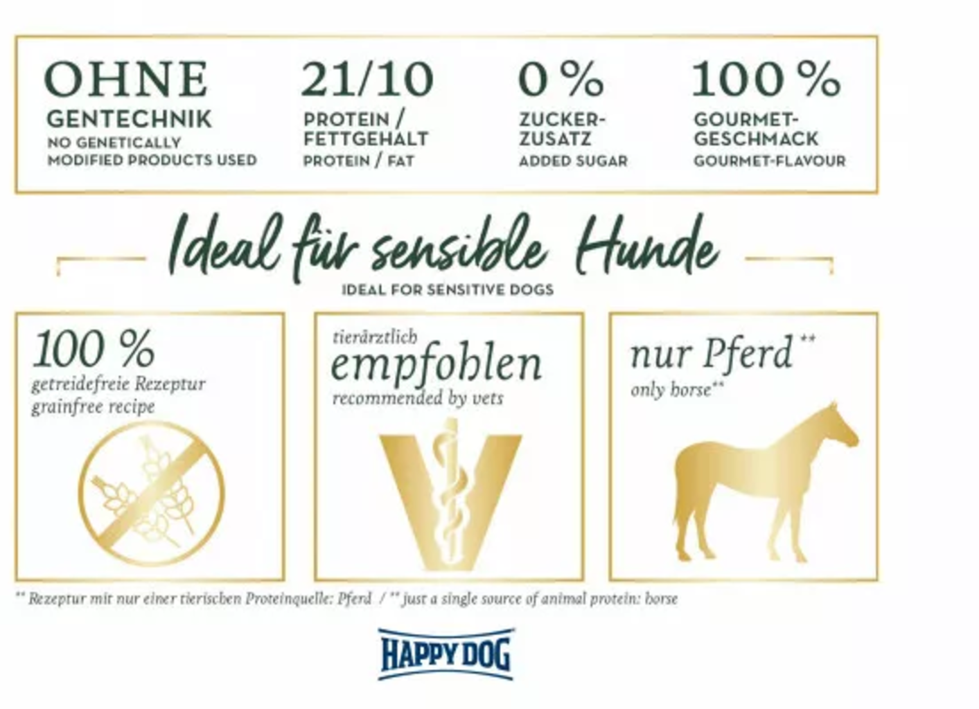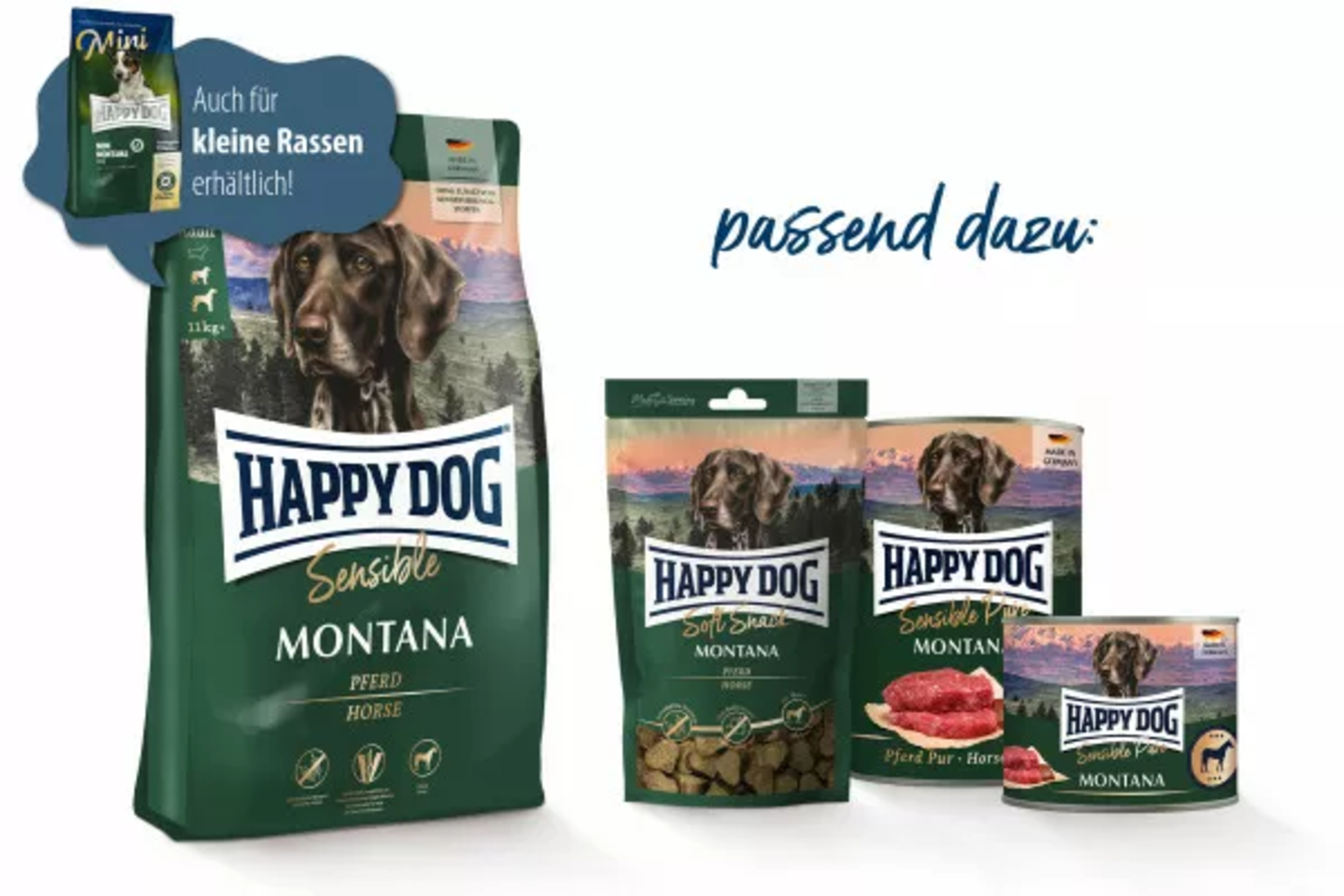 A Happy Dog márka ízletes Montana száraztápja prémium lóhúst tartalmaz kizárólagos állati fehérjeforrásként. Az ízletes receptúrát gluténmentes burgonya finomítja, amely az érzékeny gyomrú kutyusok számára is alkalmas. Omega-3 és Omega-6 zsírsavakkal.