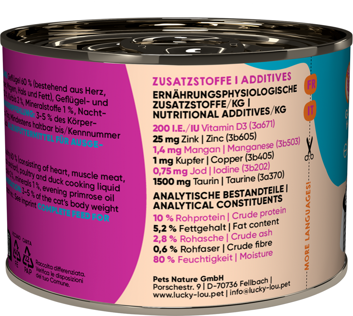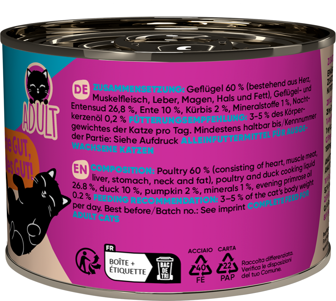 60 % baromfi (szív, izomhús, máj, gyomor, nyak, zsír), 26,8 % baromfi- és kacsalé, 10 % kacsa, 2 % tök, 1 % ásványi anyag, 0,2 % ligetszépe olaj