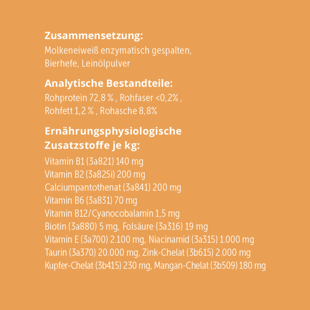 Ez az értékes kiegészítő a tejsavóból származó kiváló minőségű fehérje építőelemeken alapul, amelyek sörélesztővel, B-vitaminokkal és nyomelemekkel kombinálva nyújtanak támogatást, különösen a szőrváltás idején.