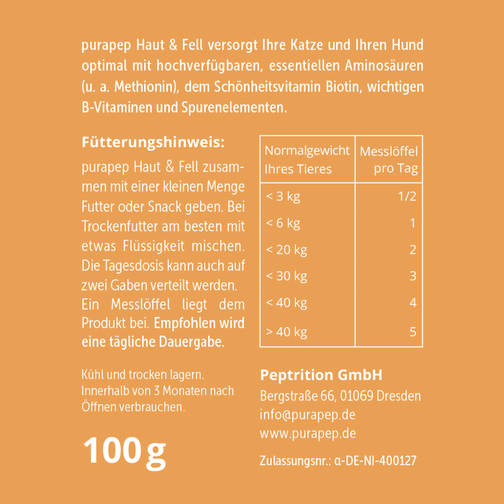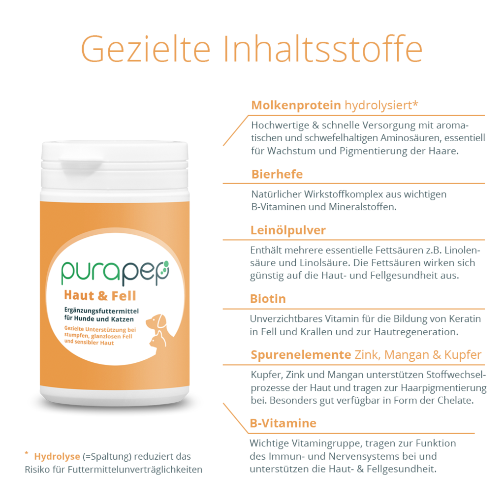 A purapep Bőr és bunda egy kiváló minőségű, por állagú kiegészítő eledel, amely kifejezetten a kutyák és macskák szőrzetének és bőrének támogatására lett kifejlesztve.