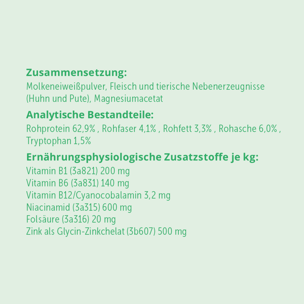 A rágótabletták egy speciális formulán alapulnak, amely a kiváló minőségű tejsavófehérjéből származó természetes triptofánt ötvözi, hogy elősegítse a kutyák kiegyensúlyozott lelkiállapotát. A triptofán mellett a formula B-vitaminok és értékes ásványi anyagok kiegyensúlyozott keverékét tartalmazza. Mesterséges színezékek, tartósítószerek és aromák nélkül, de ellenállhatatlan baromfiízzel!