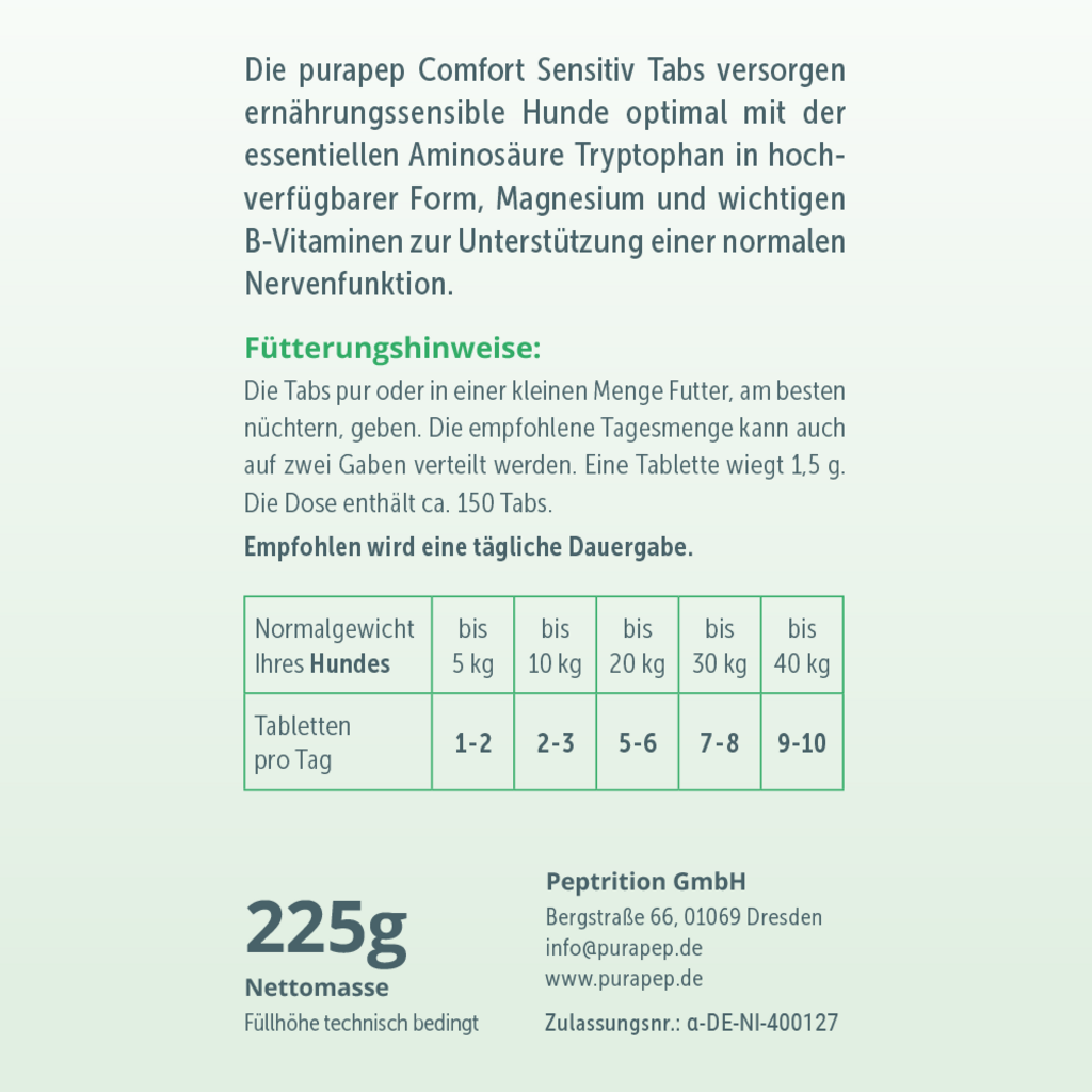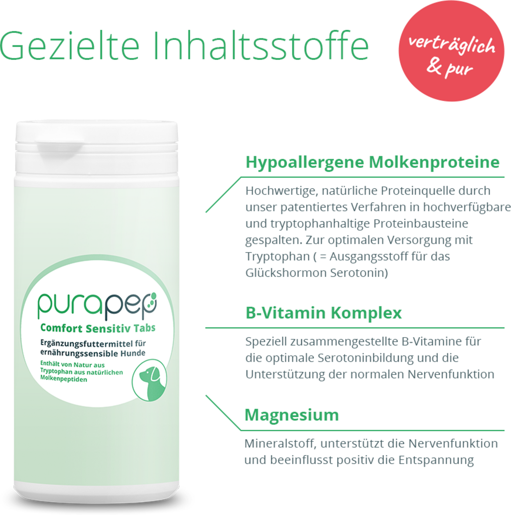 A purapep Comfort Sensitive tabletta egy kiváló minőségű kiegészítő eledel, amely arra lett kifejlesztve, hogy a táplálkozási szempontból érzékeny kutyáknak természetes támogatást nyújtson stresszes helyzetekben és a mindennapi kihívások során.