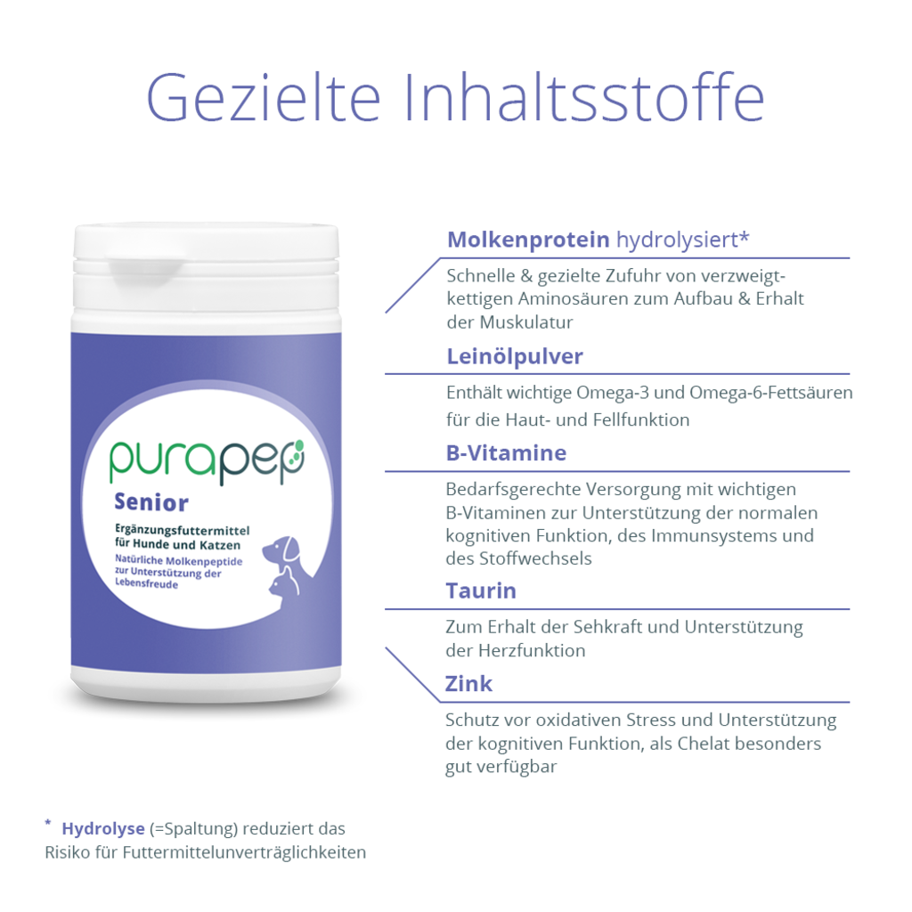 A purapep Senior egy kiváló minőségű, por állagú kiegészítő eledel, amely kifejezetten az idős macskák és kutyák szellemi és fizikai teljesítményének támogatására lett kifejlesztve.