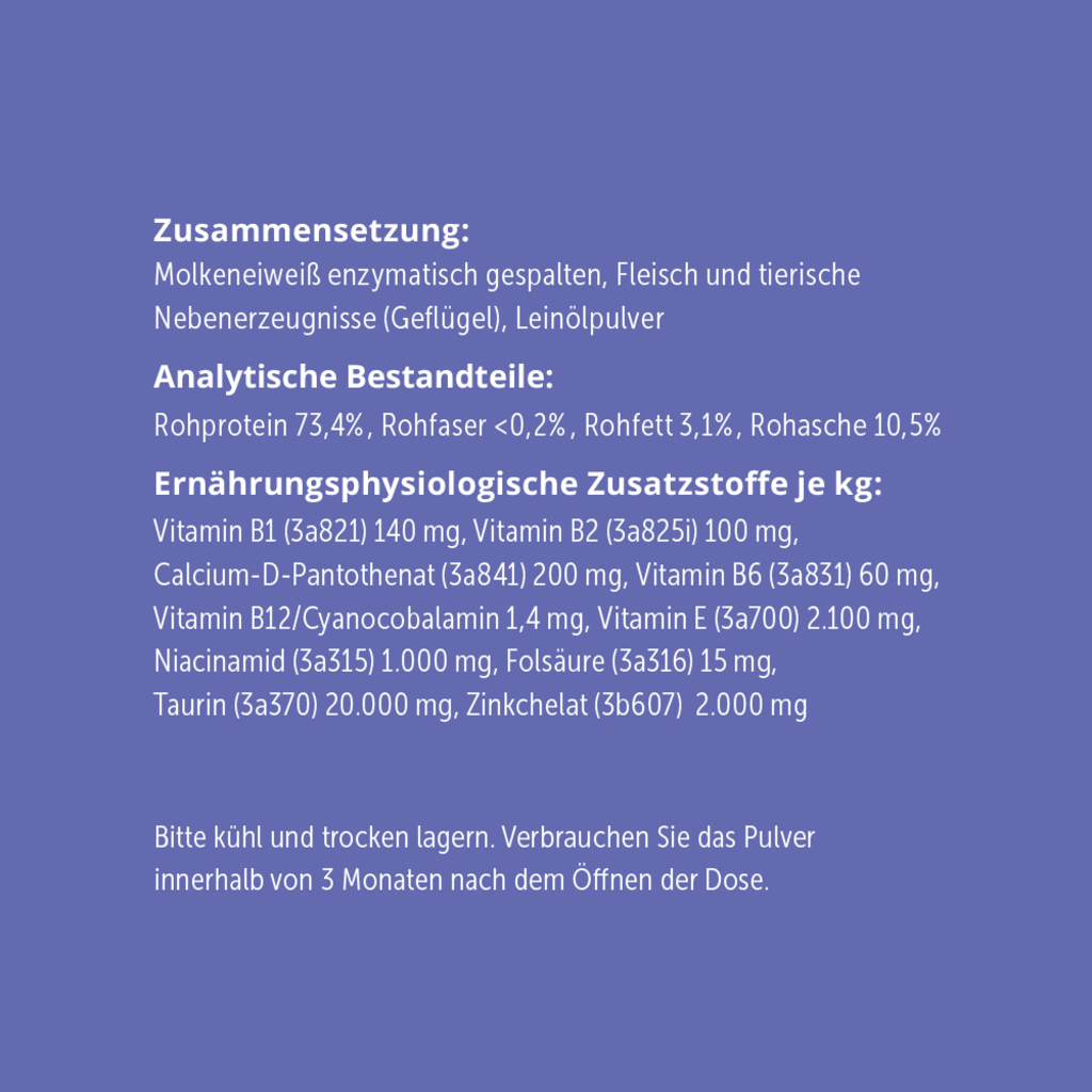 - Tejsavófehérje-hidrolizátummal, lenmagolajjal, vitaminokkal és nyomelemekkel