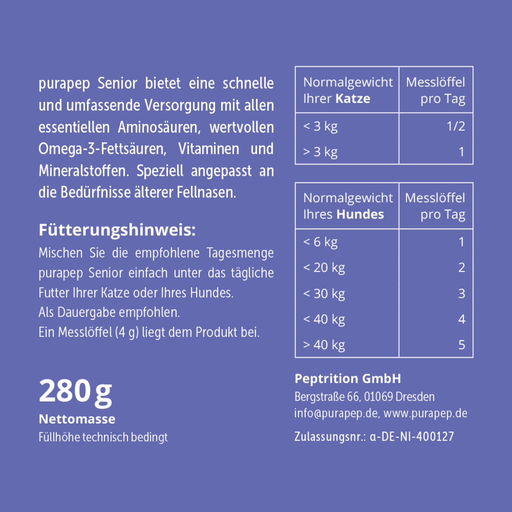 - A purapep Senior baromfimájból (csirke és pulyka) származó baromfifehérjéket tartalmaz. Ha kedvence allergiás ezekre az összetevőkre, a purapep Senior nem adható neki.