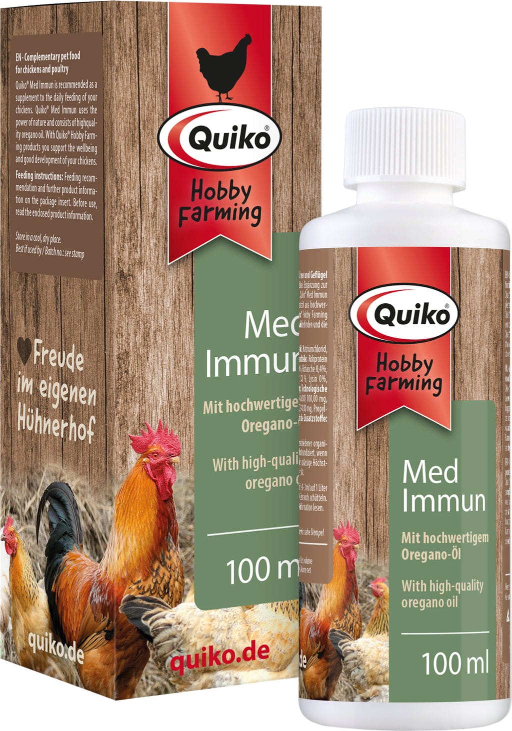- Keverjen 1 - 3 ml Quiko Med Immun-t 1 kg takarmányba vagy 1 l ivóvízbe.