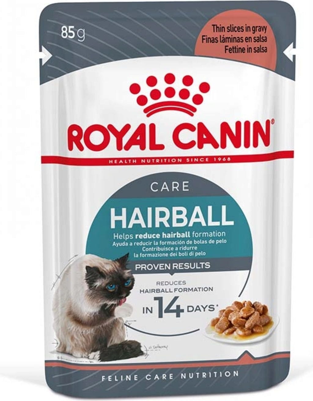 A ROYAL CANIN® Hairball Care finom falatok szószban macskatáp teljes értékű és kiegyensúlyozott receptúrával rendelkezik, amely kifejezetten a szőrlabdaképződés csökkentésére lett kifejlesztve, és serkenti a bélmozgást, hogy segítse a lenyelt szőrszálak természetes távozását.