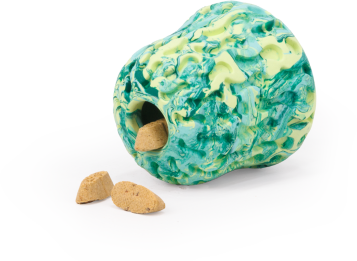 Ez a színes, természetes formájú játék nem csak apportírozásra való! A texturált felület tökéletes a jutalomfalatok elrejtésére – a sütőtöktől kezdve a mogyoróvajig bármi elfér benne. És belül? Van hely nagyobb jutalmaknak is! A tartós konstrukció ideális társsá teszi minden mérsékelten rágó játékos számára.