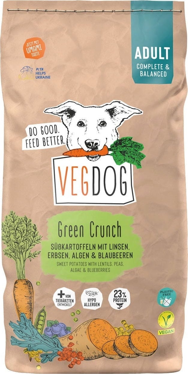 A VEGDOG Green Crunch egészséges és kiegyensúlyozott eledelt kínál azoknak a szőrös barátoknak, akik szeretik a ropogós tápokat a táljukban! A vegán száraztáp állati fehérjeforrás helyett lencséből és borsóból származó növényi fehérjeforrást használ. Az értékes és egyben ízletes receptúrát finom, omega-3 és omega-6 zsírsavakban gazdag alga, valamint édesburgonya, sütőtök, sárgarépa, áfonya és a különleges VEGDOG ásványi keverék finomítja.