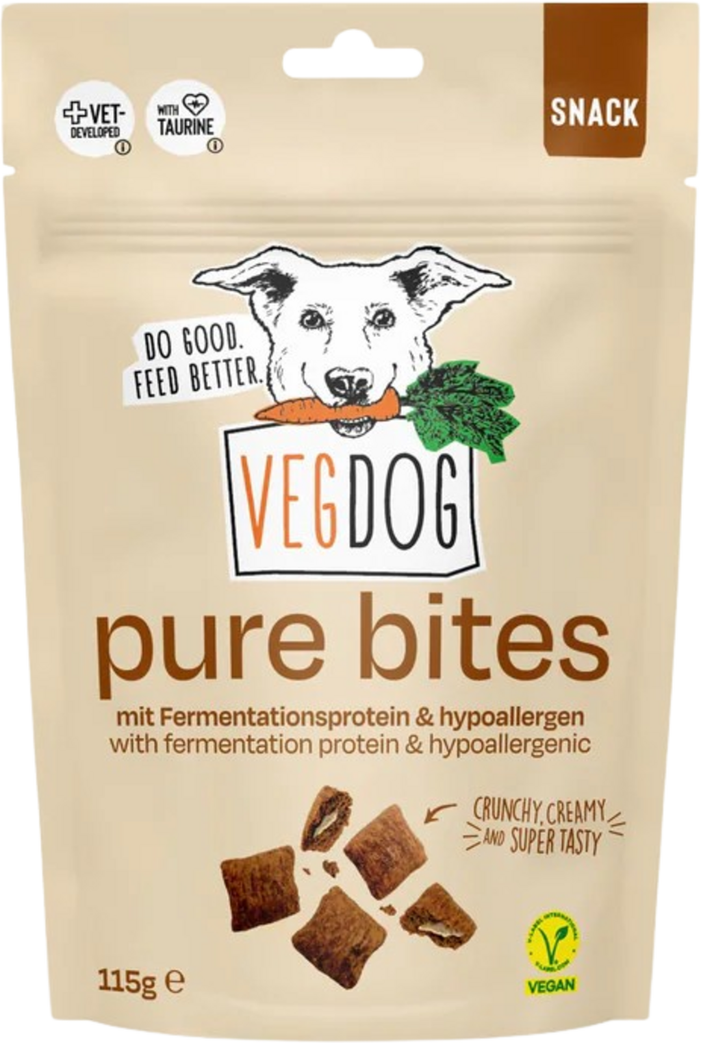 A VEGDOG Pure Bites több mint 14% fehérjét tartalmaz fermentált proteinből. Ez nem csak erőforrás-kímélő, hanem különösen finom alternatívája az állati vagy növényi fehérjéknek.