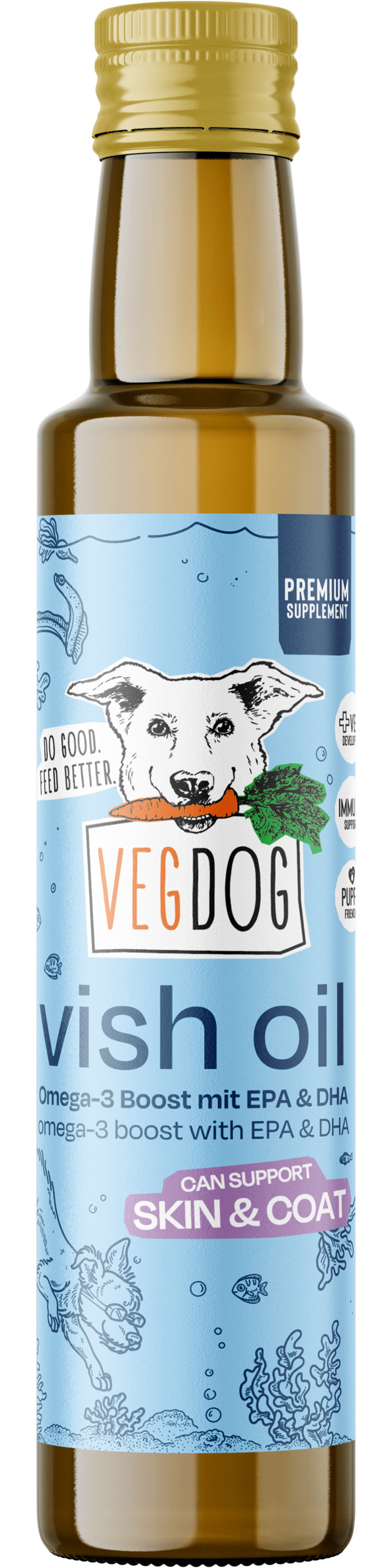A VEGDOG Vish Oil a hagyományos halolaj vegán alternatívája. Ennek az olajnak az előállításához állati eredetű helyett csak növényi alapanyagokat használnak, mint a kender, alga és lenmag. Ezek nemcsak omega-3 és omega-6 zsírsavakban gazdagok, hanem sokkal fenntarthatóbbak, állatbarátabbak és környezetbarátabbak is, mint a halolaj.