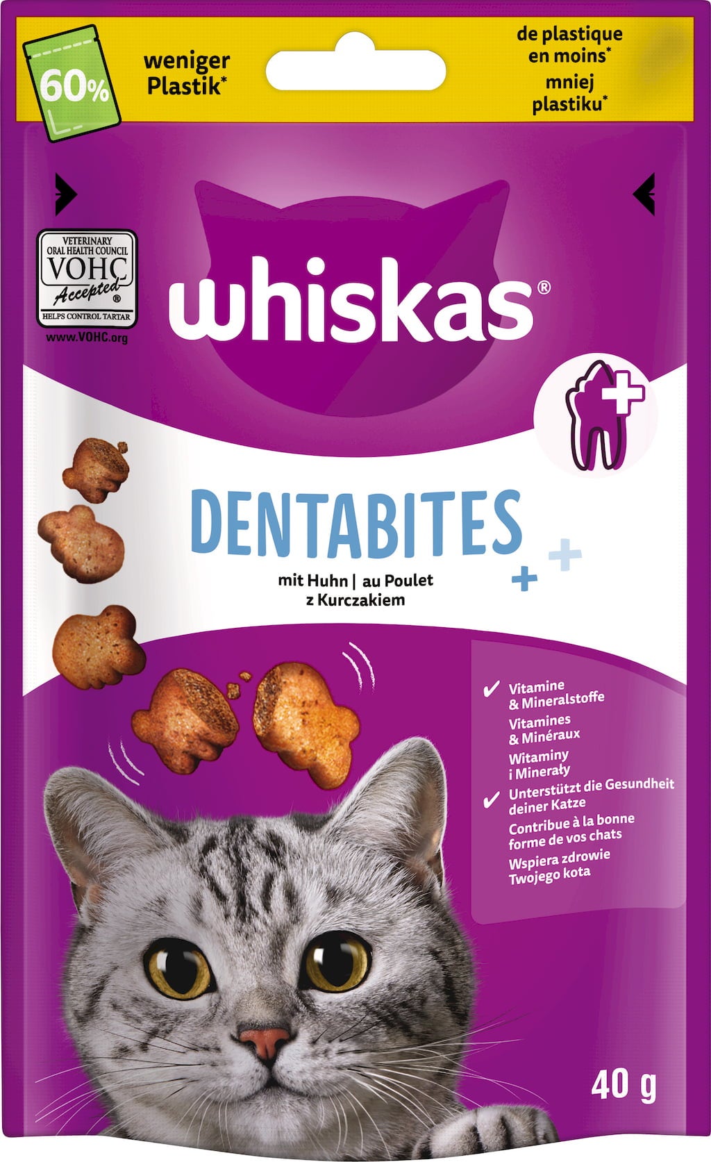 A Whiskas Dentabites ízletes kiegészítő eledel felnőtt macskáknak. A ropogós darabok nem csak finomak, de minimálisra csökkentik a fogkőképződést a VOHC (Veterinary Oral Health Council) szerint.